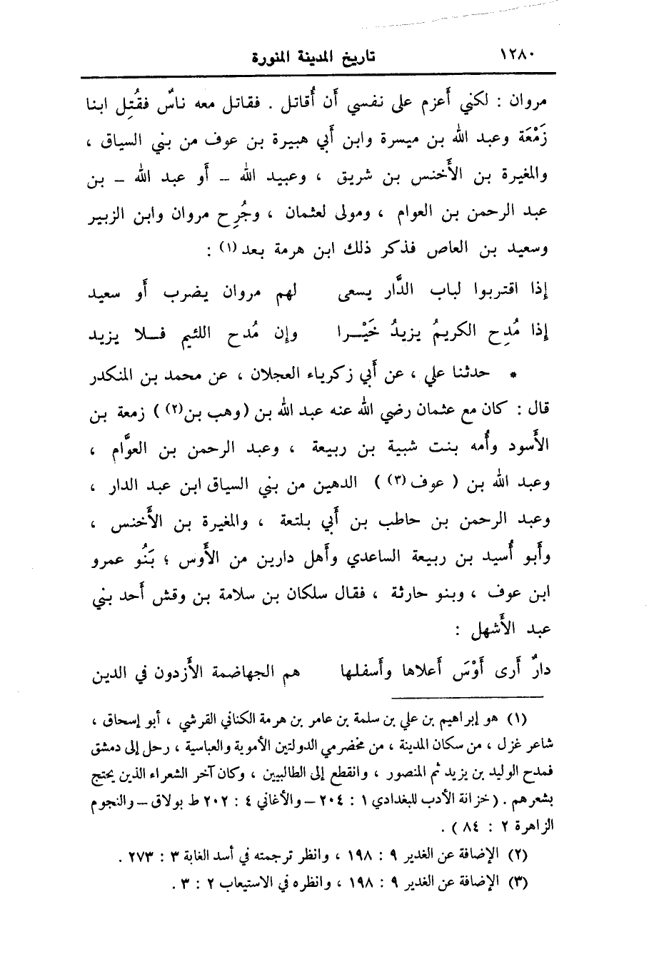 حَدَّثَنَا عَلِيٌّ، عَنْ أَبِي زَكَرِيَّاءَ الْعَجْلَانِ، عَنْ مُحَمَّدِ بْنِ الْمُنْكَدِرِ قَالَ: كَانَ مَعَ عُثْمَانَ رَضِيَ اللَّهُ عَنْهُ عَبْدُ اللَّهِ بْنُ زَمْعَةَ بْنِ الْأَسْوَدِ وَأُمُّهُ بِنْتُ شَيْبَةَ بْنِ رَبِيعَةَ، وَعَبْدُ الرَّحْمَنِ بْنُ الْعَوَّامِ، وَعَبْدُ اللَّهِ بْنُ الدَّهِينِ مِنْ بَنِي السَّيَّاقِ بْنِ عَبْدِ الدَّارِ، وَعَبْدُ الرَّحْمَنِ بْنُ حَاطِبِ بْنِ أَبِي بَلْتَعَةَ، وَالْمُغِيرَةُ بْنُ الْأَخْنَسِ، وَأَبُو أُسَيْدِ بْنُ رَبِيعَةَ السَّاعِدِيُّ وَأَهْلُ دَارَيْنِ مِنَ الْأَوْسِ، بَنُو عَمْرِو بْنِ عَوْفٍ، وَبَنُو حَارِثَةَ، فَقَالَ سَلَكَانُ بْنُ سَلَامَةَ بْنِ وَقْشٍ أَحَدُ بَنِي عَبْدِ الْأَشْهَلِ: