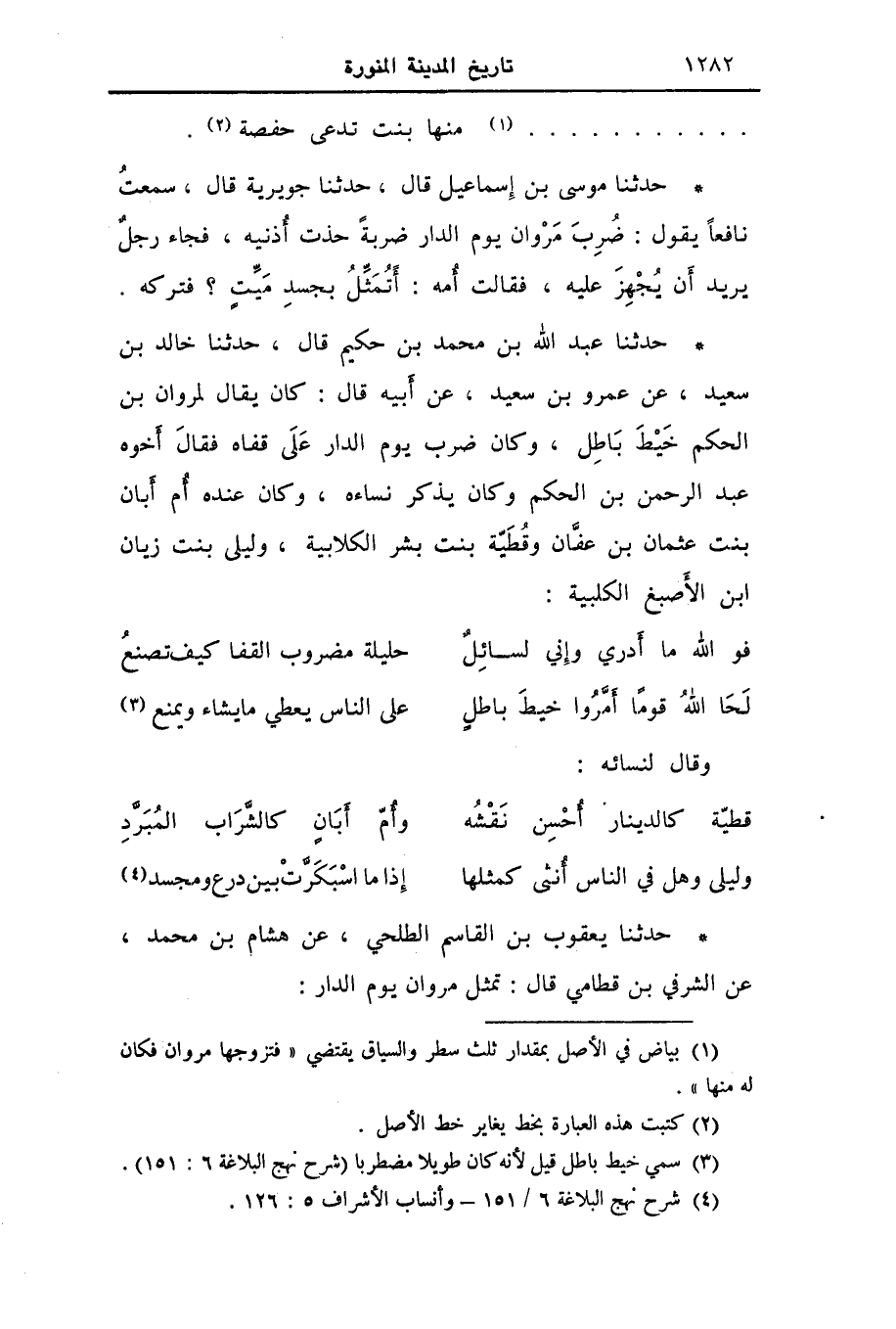 حَدَّثَنَا عَبْدُ اللَّهِ بْنُ مُحَمَّدِ بْنِ حَكِيمٍ قَالَ: حَدَّثَنَا خَالِدُ بْنُ سَعِيدٍ، عَنْ عَمْرِو بْنِ سَعِيدٍ، عَنْ أَبِيهِ قَالَ: كَانَ يُقَالُ لِمَرْوَانَ بْنِ الْحَكَمِ: §خَيْطُ بَاطِلٍ، وَكَانَ ضُرِبَ يَوْمَ الدَّارِ عَلَى قَفَاهُ , فَقَالَ أَخُوهُ عَبْدُ الرَّحْمَنِ بْنُ الْحَكَمِ وَكَانَ يَذْكُرُ نِسَاءَهُ، وَكَانَ عِنْدَهُ أُمُّ أَبَانَ بِنْتُ عُثْمَانَ بْنِ عَفَّانَ , وَقُطَيَّةُ بِنْتُ بِشْرٍ الْكِلَابِيَّةُ، وَلَيْلَى بِنْتُ زَيَّانِ ابْنِ الْأَصْبَغِ الْكَلْبِيَّةُ:
