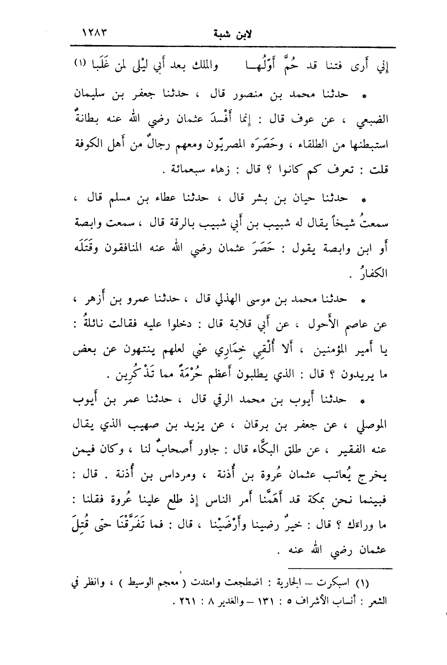 حَدَّثَنَا حَيَّانُ بْنُ بِشْرٍ قَالَ: حَدَّثَنَا عَطَاءُ بْنُ مُسْلِمٍ قَالَ: سَمِعْتُ شَيْخًا يُقَالُ لَهُ: شَبِيبُ بْنُ أَبِي شَبِيبٍ بِالرَّقَّةَ قَالَ: سَمِعْتُ وَابِصَةَ - أَوِ ابْنَ وَابِصَةَ يَقُولُ: §حَصَرَ عُثْمَانَ رَضِيَ اللَّهُ عَنْهُ الْمُنَافِقُونَ وَقَتَلَهُ الْكُفَّارُ