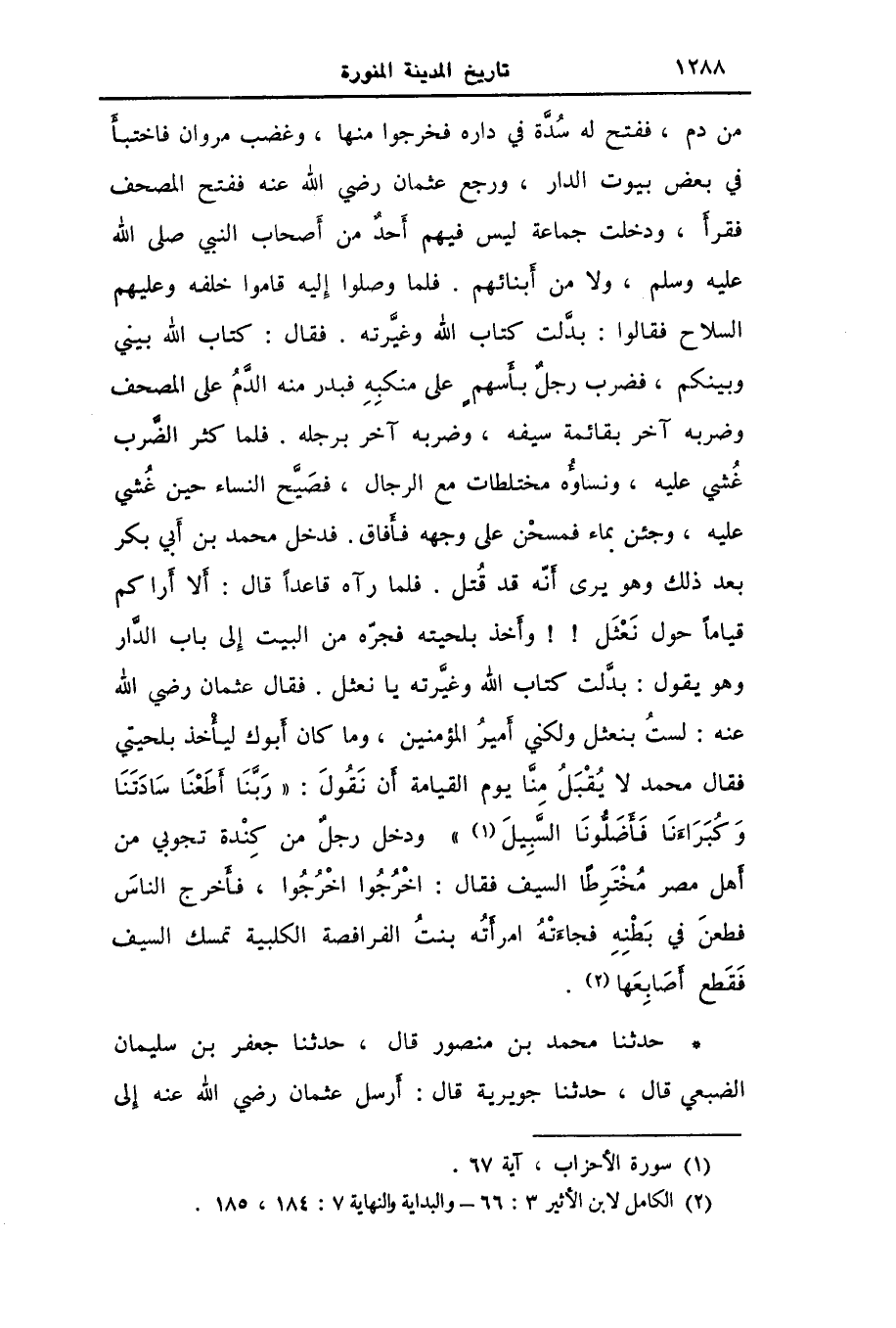 حَدَّثَنَا مُحَمَّدُ بْنُ مَنْصُورٍ قَالَ: حَدَّثَنَا جَعْفَرُ بْنُ سُلَيْمَانَ الضُّبَعِيُّ قَالَ: حَدَّثَنَا جُوَيْرِيَةُ قَالَ: أَرْسَلَ عُثْمَانُ رَضِيَ اللَّهُ عَنْهُ إِلَى -[1289]- مُعَاوِيَةُ رَضِيَ اللَّهُ عَنْهُ يَسْتَمِدُّهُ، فَبَعَثَ مُعَاوِيَةُ رَضِيَ اللَّهُ عَنْهُ يَزِيدَ بْنِ أَسَدٍ جَدَّ خَالِدٍ الْقَسْرِيِّ، وَقَالَ لَهُ: §إِذَا أَتَيْتَ ذَا خُشُبٍ فَأَقِمْ بِهَا وَلَا تَتَجَاوَزْهَا، وَلَا تَقُلِ: الشَّاهِدُ يَرَى مَا لَا يَرَى الْغَائِبُ قَالَ: أَنَا الشَّاهِدُ وَأَنْتَ الْغَائِبُ. فَأَقَامَ بِذِي خُشُبٍ حَتَّى قُتِلَ عُثْمَانُ رَضِيَ اللَّهُ عَنْهُ. فَقُلْتُ لِجُوَيْرِيَةَ: لِمَ صَنَعَ هَذَا؟ قَالَ: صَنَعَهُ عَمْدًا لِيُقْتَلَ عُثْمَانُ رَضِيَ اللَّهُ عَنْهُ فَيَدْعُو إِلَى نَفْسِهِ