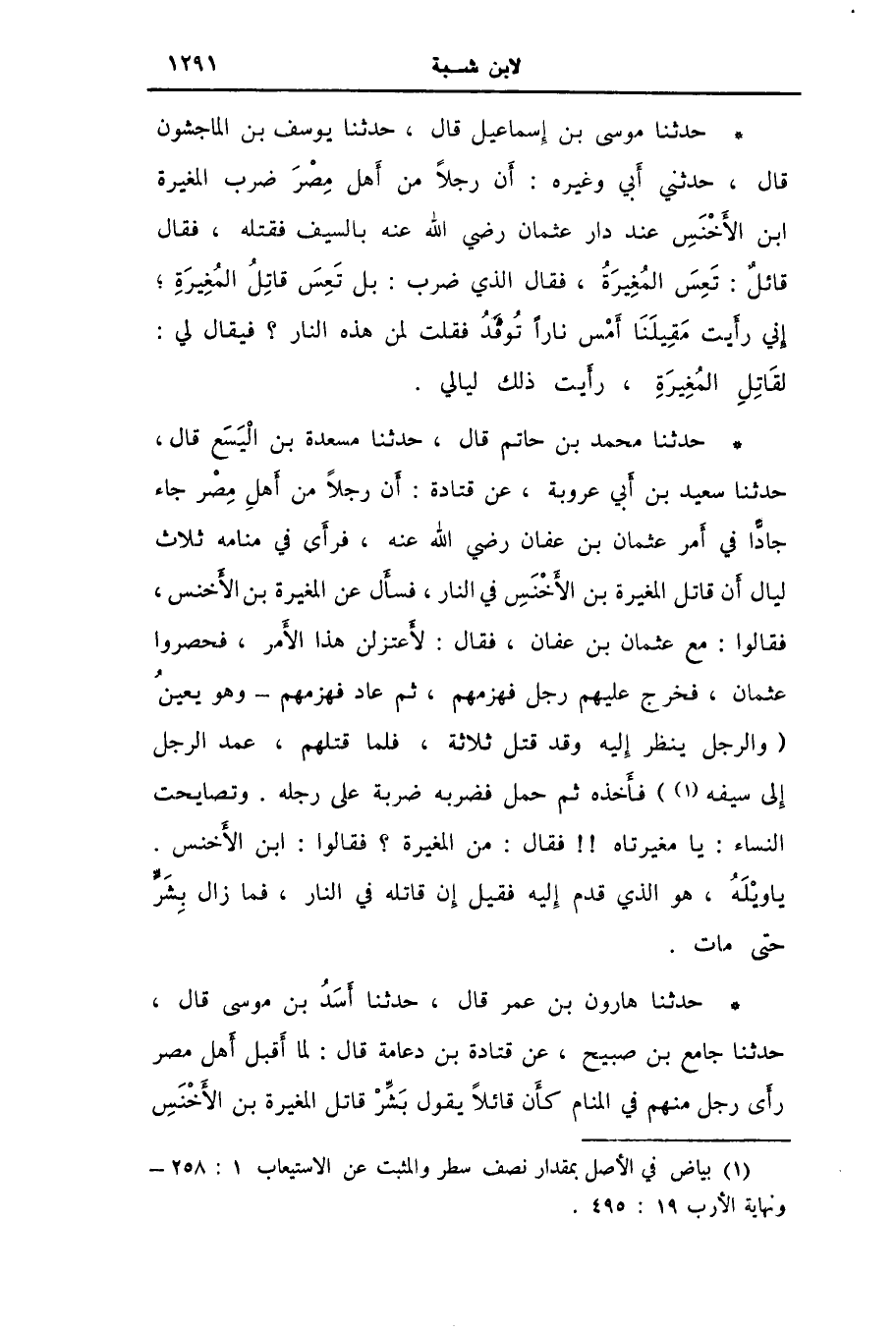 حَدَّثَنَا مُحَمَّدُ بْنُ حَاتِمٍ قَالَ: حَدَّثَنَا مَسْعَدَةُ بُنُ الْيَسَعِ قَالَ: حَدَّثَنَا سَعِيدُ بْنُ أَبِي عَرُوبَةَ، عَنْ قَتَادَةَ أَنَّ رَجُلًا مِنْ أَهْلِ مِصْرَ جَاءَ جَادًّا فِي أَمْرِ عُثْمَانَ بْنِ عَفَّانَ رَضِيَ اللَّهُ عَنْهُ، فَرَأَى فِي مَنَامِهِ ثَلَاثَ لَيَالٍ أَنَّ قَاتِلَ الْمُغِيرَةِ بْنِ الْأَخْنَسِ فِي النَّارِ، فَسَأَلَ عَنِ الْمُغِيرَةِ بْنِ الْأَخْنَسِ فَقَالُوا: مَعَ عُثْمَانَ بْنِ عَفَّانَ فَقَالَ: §لَأَعْتَزِلَنَّ هَذَا الْأَمْرَ فَحَصَرُوا عُثْمَانَ فَخَرَجَ عَلَيْهِمْ رَجُلٌ فَهَزَمَهُمْ، ثُمَّ عَادَ فَهَزَمَهُمْ , وَهُوَ يُعِينُ وَالرَّجُلُ يَنْظُرُ إِلَيْهِ وَقَدْ قَتَلَ ثَلَاثَةً، فَلَمَّا قَتَلَهُمْ عَمَدَ الرَّجُلُ إِلَى سَيْفِهِ فَأَخَذَهُ , ثُمَّ حَمَلَ فَضَرَبَهُ ضَرْبَةً عَلَى رِجْلِهِ. وَتَصَايَحَتِ النِّسَاءُ: يَا مُغِيرَتَاهُ فَقَالَ: مَنِ الْمُغِيرَةُ؟ فَقَالُوا: ابْنَ الْأَخْنَسِ. يَا وَيْلَهُ، هُوَ الَّذِي قَدِمَ إِلَيْهِ فَقِيلَ: إِنَّ قَاتِلَهُ فِي النَّارِ، فَمَا زَالَ بِشَرٍّ حَتَّى مَاتَ