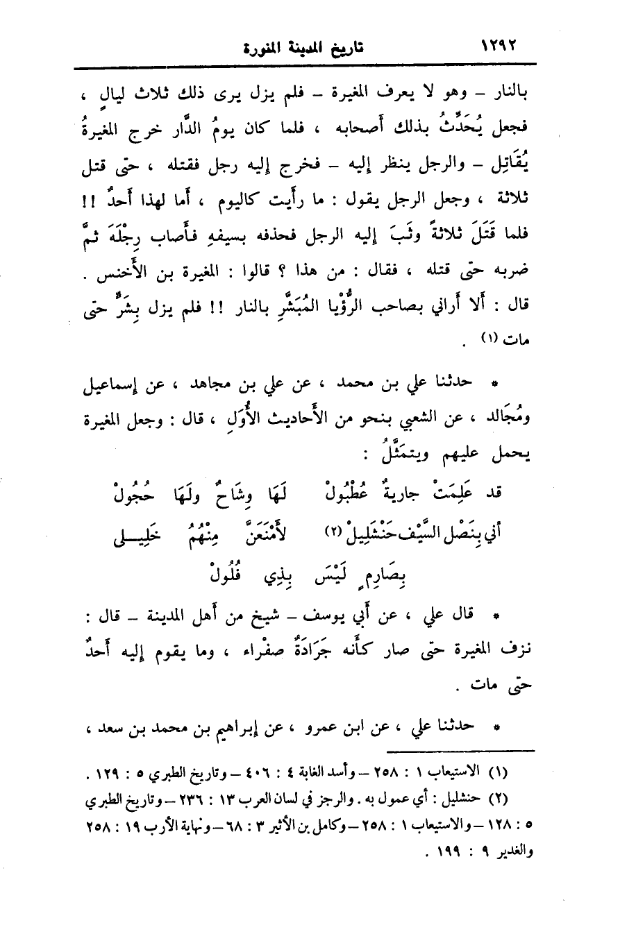 بِالنَّارِ , وَهُوَ لَا يَعْرِفُ الْمُغِيرَةَ , فَلَمْ يَزَلْ يَرَى ذَلِكَ ثَلَاثَ لَيَالٍ، فَجَعَلَ يُحَدِّثُ بِذَلِكَ أَصْحَابَهُ، فَلَمَّا كَانَ يَوْمُ الدَّارِ خَرَجَ الْمُغِيرَةُ يُقَاتِلُ , وَالرَّجُلُ يَنْظُرُ إِلَيْهِ , فَخَرَجَ إِلَيْهِ رَجُلٌ فَقَتَلَهُ، حَتَّى قَتَلَ ثَلَاثَةً، وَجَعَلَ الرَّجُلُ يَقُولُ: مَا رَأَيْتُ كَالْيَوْمِ، أَمَا لِهَذَا أَحَدٌ فَلَمَّا قَتَلَ ثَلَاثَةً وَثَبَ إِلَيْهِ الرَّجُلُ فَحَذَفَهُ بِسَيْفِهِ فَأَصَابَ رِجْلَهُ , ثُمَّ ضَرَبَهُ حَتَّى قَتَلَهُ، فَقَالَ: مَنْ هَذَا؟ قَالُوا: الْمُغِيرَةُ بْنُ الْأَخْنَسِ. قَالَ: «أَلَا أُرَانِي بِصَاحِبِ الرُّؤْيَا الْمُبَشَّرِ بِالنَّارِ» فَلَمْ يَزَلْ بِشَرٍّ حَتَّى مَاتَ. حَدَّثَنَا عَلِيُّ بْنُ مُحَمَّدٍ، عَنْ عَلِيِّ بْنِ مُجَاهِدٍ، عَنْ إِسْمَاعِيلَ، وَمُجَالِدٍ، عَنِ الشَّعْبِيِّ، بِنَحْو مِنَ الْأَحَادِيثِ الْأُوَلِ، قَالَ: وَجَعَلَ الْمُغِيرَةُ يَحْمِلُ عَلَيْهِمْ وَيَتَمَثَّلُ: