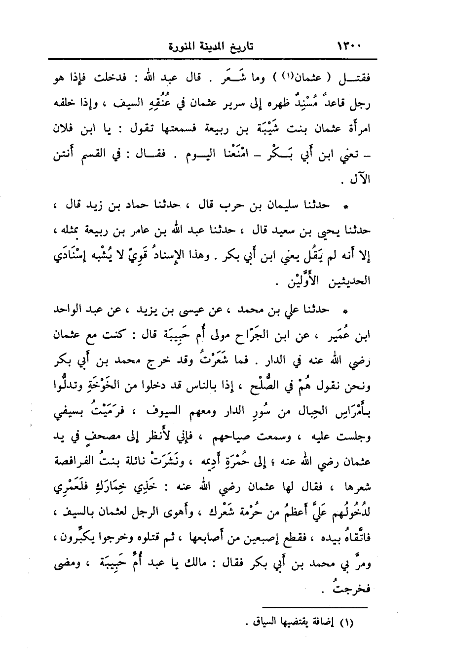 فَقُتِلَ وَمَا شَعَرَ. قَالَ عَبْدُ اللَّهِ: فَدَخَلْتُ فَإِذَا هُوَ رَجُلٌ قَاعِدٌ مُسْنِدٌ ظَهْرَهُ إِلَى سَرِيرِ عُثْمَانَ فِي عُنُقِهِ السَّيْفُ، وَإِذَا خَلْفَهُ امْرَأَةُ عُثْمَانَ بِنْتُ شَيْبَةَ بْنِ رَبِيعَةَ فَسَمِعْتُهَا تَقُولُ: يَا ابْنَ فُلَانٍ تَعْنِي ابْنَ أَبِي بَكْرٍ امْنَعْنَا الْيَوْمَ. فَقَالَ: فِي الْقَسَمِ أَنْتُنَّ الْآلُ. حَدَّثَنَا سُلَيْمَانُ بْنُ حَرْبٍ قَالَ: حَدَّثَنَا حَمَّادُ بْنُ زَيْدٍ قَالَ: حَدَّثَنَا يَحْيَى بْنُ سَعِيدٍ قَالَ: حَدَّثَنَا عَبْدُ اللَّهِ بْنُ عَامِرِ بْنِ رَبِيعَةَ بِمِثْلِهِ إِلَّا أَنَّهُ لَمْ يَقُلْ: يَعْنِي ابْنَ أَبِي بَكْرٍ. وَهَذَا الْإِسْنَادُ قَوِيٌّ لَا يُشْبِهُ إِسْنَادَيِ الْحَدِيثَيْنِ الْأَوَّلَيْنِ