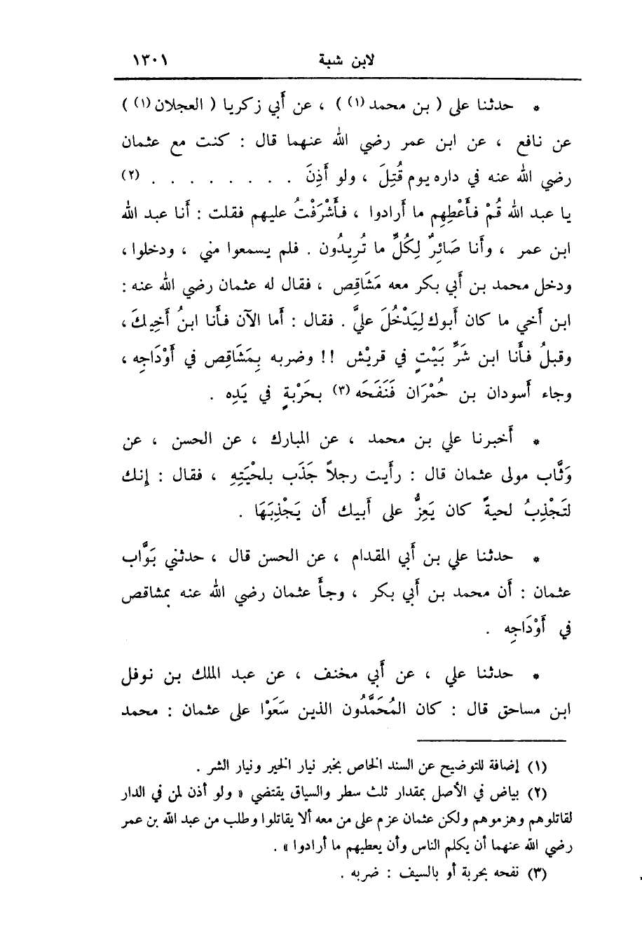 حَدَّثَنَا عَلِيٌّ، عَنْ أَبِي زَكَرِيَّا، عَنْ نَافِعٍ، عَنِ ابْنِ عُمَرَ رَضِيَ اللَّهُ عَنْهُمَا قَالَ: كُنْتُ مَعَ عُثْمَانَ رَضِيَ اللَّهُ عَنْهُ فِي دَارِهِ يَوْمَ قُتِلَ، وَلَوْ أَذِنَ. . . . . يَا عَبْدَ اللَّهِ قُمْ فَأَعْطِهِمْ مَا أَرَادُوا، فَأَشْرَفْتُ عَلَيْهِمْ فَقُلْتُ: أَنَا عَبْدُ اللَّهِ بْنُ عُمَرَ، وَأَنَا صَائِرٌ لِكُلِّ مَا تُرِيدُونَ فَلَمْ يَسْمَعُوا مِنِّي، وَدَخَلَوا، وَدَخَلَ مُحَمَّدُ بْنُ أَبِي بَكْرٍ مَعَهُ مَشَاقِصُ، فَقَالَ لَهُ عُثْمَانُ رَضِيَ اللَّهُ عَنْهُ: «ابْنَ أَخِي §مَا كَانَ أَبُوكَ لِيَدْخُلَ عَلَيَّ» . فَقَالَ: أَمَّا الْآنَ فَأَنَا ابْنُ أَخِيكَ، وَقَبْلُ فَأَنَا ابْنُ شَرِّ بَيْتٍ فِي قُرَيْشٍ وَضَرَبَهُ بِمَشَاقِصَ فِي أَوْدَاجِهِ، وَجَاءَ سَوْدَانُ بْنُ حُمْرَانَ فَنَفَحَهُ بِحَرْبَةٍ فِي يَدِهِ
