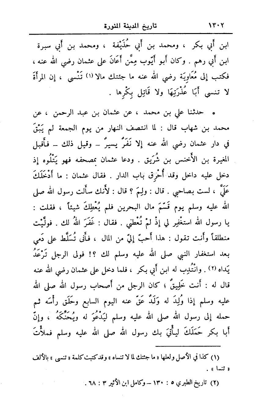 حَدَّثَنَا عَلِيُّ بْنُ مُحَمَّدٍ، عَنْ عُثْمَانَ بْنِ عَبْدِ الرَّحْمَنِ، عَنْ مُحَمَّدِ بْنِ شِهَابٍ قَالَ: لَمَّا انْتَصَفَ النَّهَارُ مِنْ يَوْمِ الْجُمُعَةِ لَمْ يَبْقَ فِي دَارِ عُثْمَانَ رَضِيَ اللَّهُ عَنْهُ إِلَّا نَفَرٌ يَسِيرٌ , وَقِيلَ ذَلِكَ , فَأَقْبَلَ الْمُغِيرَةُ بْنُ الْأَخْنَسِ بْنِ شَرِيقٍ. وَدَعَا عُثْمَانُ بِمُصْحَفِهِ فَهُوَ يَتْلُوهُ إِذْ دَخَلَ عَلَيْهِ دَاخِلٌ وَقَدْ أُحْرِقَ بَابُ الدَّارِ. فَقَالَ عُثْمَانُ: مَا أَدْخَلَكَ عَلَيَّ، لَسْتَ بِصَاحِبِي. قَالَ: وَلِمَ؟ قَالَ: لِأَنَّكَ سَأَلْتَ رَسُولَ اللَّهِ صَلَّى اللهُ عَلَيْهِ وَسَلَّمَ يَوْمَ قَسَمَ مَالَ الْبَحْرَيْنِ فَلَمْ يُعْطِكَ شَيْئًا، فَقُلْتَ: يَا رَسُولَ اللَّهِ اسْتَغْفِرْ لِي إِذْ لَمْ تُعْطِنِي. فَقَالَ: «§غَفَرَ اللَّهُ لَكَ» . فَوَلَّيْتَ مُنْطَلِقًا وَأَنْتَ تَقُولُ: هَذَا أَحَبُّ إِلَيَّ مِنَ الْمَالِ، فَأَنَّى تُسَلَّطُ عَلَى دَمِي بَعْدَ اسْتِغْفَارِ النَّبِيِّ صَلَّى اللهُ عَلَيْهِ وَسَلَّمَ لَكَ؟ فَوَلَّى الرَّجُلُ تُرْعِدُ يَدَاهُ وَانْتُدِبَ لَهُ ابْنُ أَبِي بَكْرٍ فَلَمَّا دَخَلَ عَلَى عُثْمَانَ رَضِيَ اللَّهُ عَنْهُ قَالَ لَهُ: أَنْتَ خَلِيقٌ، كَانَ الرَّجُلُ مِنْ أَصْحَابِ رَسُولِ اللَّهِ صَلَّى اللهُ عَلَيْهِ وَسَلَّمَ إِذَا وُلِدَ لَهُ وَلَدٌ عَقَّ عَنْهُ الْيَوْمَ السَّابِعَ وَحَلَقَ رَأْسَهُ , ثُمَّ حَمَلَهُ إِلَى رَسُولِ اللَّهِ صَلَّى اللهُ عَلَيْهِ وَسَلَّمَ لِيَدْعُوَ لَهُ وَيُحَنِّكَهُ وَإِنَّ أَبَا بَكْرٍ حَمَلَكَ لِيَأْتِيَ بِكَ رَسُولَ اللَّهِ صَلَّى اللهُ عَلَيْهِ وَسَلَّمَ فَمَلَأْتَ -[1303]- خِرَقَكَ فَاسْتَحَى أَبُو بَكْرٍ رَضِيَ اللَّهُ عَنْهُ أَنْ يُقَرِّبَكَ إِلَيْهِ صَلَّى اللهُ عَلَيْهِ وَسَلَّمَ عَلَى ذَلِكَ الْحَالِ، فَرَدَّكَ كَمَا أَتَى بِكَ فَأَنْتَ صَاحِبِي. فَتَنَاوَلَ لِحْيَتَهُ وَقَالَ: يَا نَعْثَلُ. فَقَالَ: بِئْسَ الْوَضْعُ وَضَعْتَ يَدَكَ، وَلَوْ كَانَ أَبُوكَ مَكَانَكَ لَأَكْرَمَنِي أَنْ يَضَعَ يَدَهُ مَكَانَ يَدِكَ. فَأَهْوَى بِمَشَاقِصَ كَانَتْ مَعَهُ إِلَى وَجْهِهِ، وَهُوَ يُرِيدُ بِهَا عَيْنَيْهِ، فَزَلَّتْ فَأَصَابَتْ أَوْدَاجَهُ , وَهُوَ يَتْلُو الْقُرْآنَ وَمُصْحَفٌ فِي حِجْرِهِ , فَجَعَلَ يَتَكَفَّفُ الدَّمَ فَإِذَا رَاحَتُهُ مِنْهُ نَفِحَةٌ وَقَالَ: اللَّهُمَّ لَيْسَ لِهَذَا طَالِبٌ. . . . فِي شَرَاسِيفَ عُثْمَانَ حَتَّى خَالَطَ جَوْفَهُ، وَدَخَلَ عَمْرُو بْنُ الْحَمِقِ، وَكِنَانَةُ بْنُ بِشْرٍ، وَابْنُ رُومَانَ، وَعَبْدُ الرَّحْمَنِ بْنُ عُدَيْسٍ , فَمَالُوا عَلَيْهِ بِأَسْيَافِهِمْ حَتَّى قَتَلُوهُ. وَخَرَجَ خَارِجٌ إِلَى الْمَسْجِدِ فَأَخْبَرَ بِقَتْلِهِ، فَقَالَ قَائِلٌ: مَا أَظُنُّكُمْ فَعَلْتُمْ، فَعُودُوا فَعَادُوا , وَقَدْ حَسَرَتْ نَائِلَةُ بِنْتُ الْفُرَافِصَةِ عَنْ رَأْسِهَا لِتَكُفَّهُمْ , فَاقْتَحَمُوا، فَقَالَتْ: يَا أَعْدَاءَ اللَّهِ وَكَيْفَ لَا تَدْخُلُونَ عَلَيَّ وَقَدْ رَكِبْتُمُ الذَّنْبَ الْعَظِيمَ وَتَنَاوَلَتْ سَيْفَ أَحَدِهِمْ فَاجْتَذَبَهُ فَقَطَعَ إِصْبَعَيْنِ مِنْ أَصَابِعِهَا