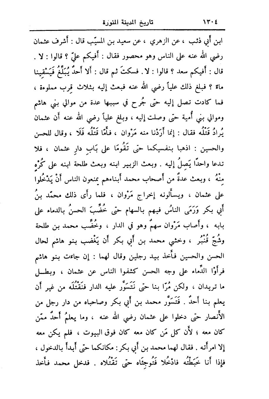 ابْنُ أَبِي ذِئْبٍ، عَنِ الزُّهْرِيِّ، عَنْ سَعِيدِ بْنِ الْمُسَيِّبِ قَالَ: أَشْرَفَ عُثْمَانُ رَضِيَ اللَّهُ عَنْهُ عَلَى النَّاسِ وَهُوَ مَحْصُورٌ فَقَالَ: أَفِيكُمْ عَلِيٌّ؟ قَالُوا: لَا. قَالَ: §أَفِيكُمْ سَعْدٌ؟ قَالُوا: لَا. فَسَكَتَ , ثُمَّ قَالَ: أَلَا أَحَدَ يُبَلِّغُ مَاءً؟ فَبَلَغَ ذَلِكَ عَلِيًّا رَضِيَ اللَّهُ عَنْهُ , فَبَعَثَ إِلَيْهِ بِثَلَاثِ قِرَبٍ مَمْلُوءَةٍ، فَمَا كَادَتْ تَصِلُ إِلَيْهِ حَتَّى جُرِحَ فِي سَبَبِهَا عِدَّةٌ مِنْ مَوَالِي بَنِي هَاشِمٍ وَمَوَالِي بَنِي أُمَيَّةَ حَتَّى وَصَلَتْ إِلَيْهِ، وَبَلَغَ عَلِيًّا رَضِيَ اللَّهُ عَنْهُ أَنَّ عُثْمَانَ يُرَادُ قَتْلُهُ , فَقَالَ: إِنَّمَا أَرَدْنَا مِنْهُ مَرْوَانَ، فَأَمَّا قَتْلُهُ فَلَا، وَقَالَ لِلْحَسَنِ وَالْحُسَيْنِ: اذْهَبَا بِنَفْسَيْكُمَا حَتَّى تَقُومَا عَلَى بَابِ دَارِ عُثْمَانَ فَلَا تَدَعَا وَاحِدًا يَصِلُ إِلَيْهِ. وَبَعَثَ الزُّبَيْرُ ابْنَهُ وَبَعَثَ طَلْحَةُ ابْنَهُ عَلَى كُرْهٍ مِنْهُ، وَبَعَثَ عِدَّةٌ مِنْ أَصْحَابِ مُحَمَّدٍ أَبْنَاءَهُمْ يَمْنَعُونَ النَّاسَ أَنْ يَدْخُلُوا عَلَى عُثْمَانَ، وَيَسْأَلُونَهُ إِخْرَاجَ مَرْوَانَ، فَلَمَّا رَأَى ذَلِكَ مُحَمَّدُ بْنُ أَبِي بَكْرٍ وَرَمَى النَّاسُ فِيهِمْ بِالسِّهَامِ حَتَّى خُضِّبَ الْحَسَنُ بِالدِّمَاءِ عَلَى بَابِهِ، وَأَصَابَ مَرْوَانَ سَهْمٌ وَهُوَ فِي الدَّارِ، وَخُضِّبَ مُحَمَّدُ بْنُ طَلْحَةَ , وَشُجَّ قُنْبَرٌ، وَخَشِيَ مُحَمَّدُ بْنُ أَبِي بَكْرٍ أَنْ يَغْضَبَ بَنُو هَاشِمٍ لِحَالِ الْحَسَنِ وَالْحُسَيْنِ فَأَخَذَ بِيَدِ رَجُلَيْنِ وَقَالَ لَهُمَا: إِنْ جَاءَتْ بَنُو هَاشِمٍ فَرَأَوَا الدِّمَاءَ عَلَى وَجْهِ الْحَسَنِ كَشَفُوا النَّاسَ عَنْ عُثْمَانَ، وَبَطَلَ مَا تُرِيدَانِ، وَلَكِنْ مُرَّا بِنَا حَتَّى نَتَسَوَّرَ عَلَيْهِ الدَّارَ , فَنَقْتُلَهُ مِنْ غَيْرِ أَنْ يَعْلَمَ بِنَا أَحَدٌ. فَتَسَوَّرَ مُحَمَّدُ بْنُ أَبِي بَكْرٍ وَصَاحِبَاهُ مِنْ دَارِ رَجُلٍ مِنَ الْأَنْصَارِ حَتَّى دَخَلُوا عَلَى عُثْمَانَ، رَضِيَ اللَّهُ عَنْهُ وَمَا يَعْلَمُ أَحَدٌ مِمَّنْ كَانَ مَعَهُ؛ لِأَنَّ كُلَّ مَنْ كَانَ مَعَهُ كَانَ فَوْقَ الْبُيُوتِ، فَلَمْ يَكُنْ مَعَهُ إِلَّا امْرَأَتُهُ. فَقَالَ لَهُمَا مُحَمَّدُ بْنُ أَبِي بَكْرٍ: مَكَانَكُمَا حَتَّى أَبْدَأَ بِالدُّخُولِ، فَإِذَا أَنَا خَبَطْتُهُ فَادْخُلَا فَتُوجِئَاهُ حَتَّى تَقْتُلَاهُ. فَدَخَلَ مُحَمَّدٌ فَأَخَذَ