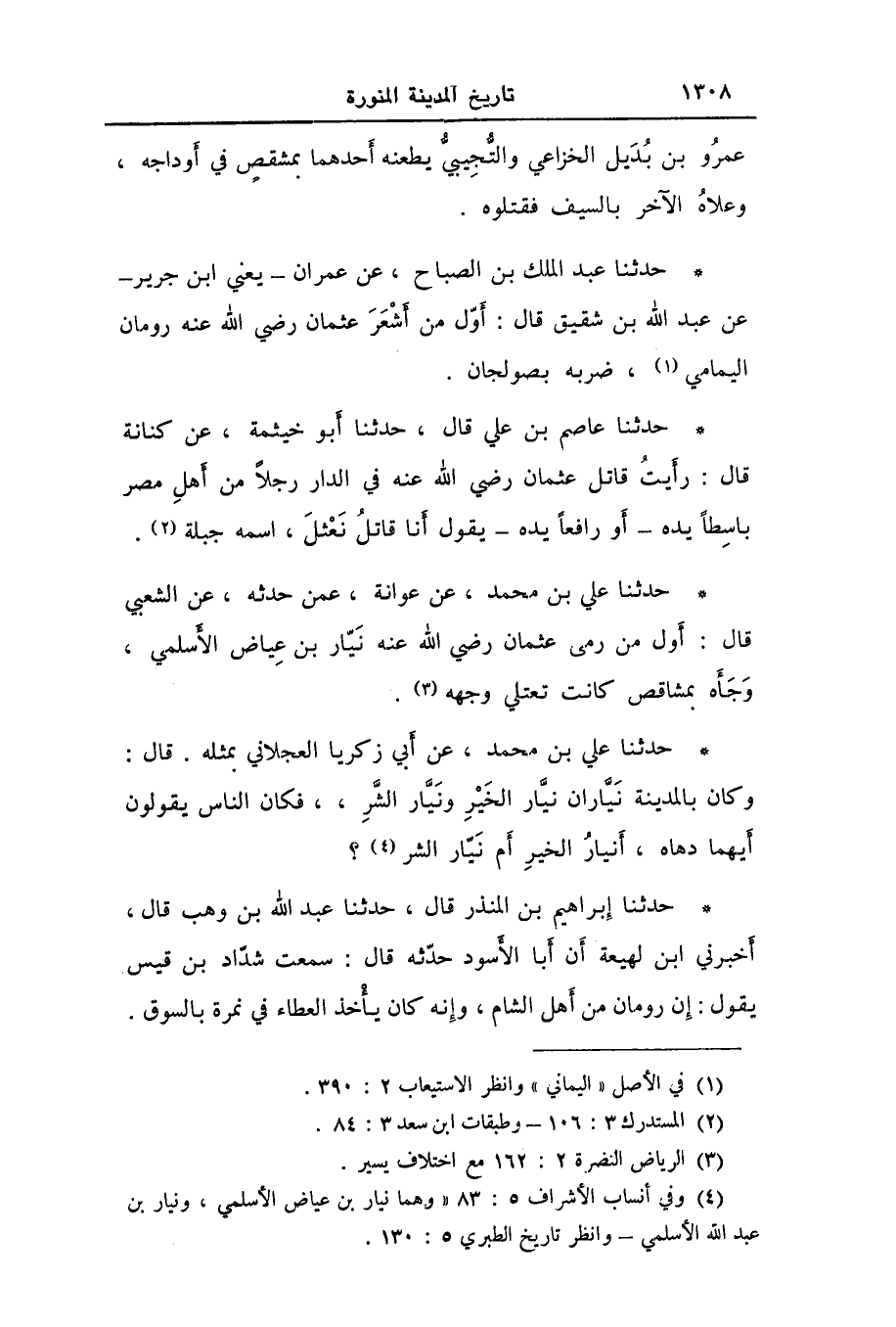 حَدَّثَنَا عَبْدُ الْمَلِكِ بْنُ الصَّبَّاحِ، عَنْ عِمْرَانَ يَعْنِي ابْنَ حُدَيْرٍ , عَنْ عَبْدِ اللَّهِ بْنِ شَقِيقٍ قَالَ: «§أَوَّلُ مَنْ أَشْعَرَ عُثْمَانَ رَضِيَ اللَّهُ عَنْهُ رُومَانُ الْيَمَانِيُّ، ضَرَبَهُ بِصَوْلَجَانٍ»