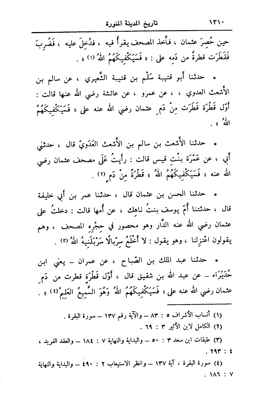 حَدَّثَنَا الْأَشْعَثُ بْنُ سَالِمٍ الْأَشْعَثِ الْعَدَوِيُّ قَالَ: حَدَّثَنِي أَبِي، عَنْ عَمْرَةَ بِنْتِ قَيْسٍ قَالَتْ: §رَأَيْتُ عَلَى مُصْحَفِ عُثْمَانَ رَضِيَ اللَّهُ عَنْهُ {فَسَيَكْفِيكَهُمُ اللَّهُ} [البقرة: 137] قَطْرَةً مِنْ دَمٍ