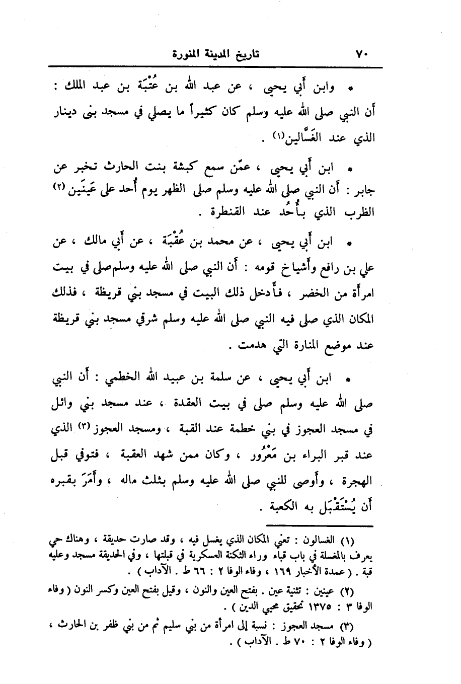 وَابْنُ أَبِي يَحْيَى، عَنْ عَبْدِ اللَّهِ بْنِ عُتْبَةَ بْنِ عَبْدِ الْمَلِكِ، أَنَّ §النَّبِيَّ صَلَّى اللهُ عَلَيْهِ وَسَلَّمَ كَانَ كَثِيرًا مَا يُصَلِّي فِي مَسْجِدِ بَنِي دِينَارٍ الَّذِي عِنْدَ الْغَسَّالِينَ "