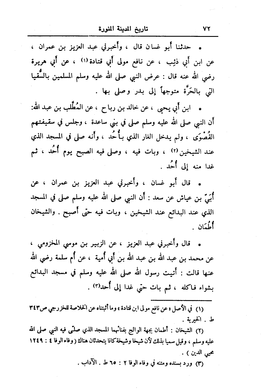 قَالَ أَبُو غَسَّانَ: وَأَخْبَرَنِي عَبْدُ الْعَزِيزِ بْنُ عِمْرَانَ، عَنْ أُبَيِّ بْنِ عَبَّاسٍ، عَنْ سَعْدٍ «أَنَّ §النَّبِيَّ صَلَّى اللهُ عَلَيْهِ وَسَلَّمَ صَلَّى فِي الْمَسْجِدِ الَّذِي عِنْدَ الْبَدَائِعِ عِنْدَ الشَّيْخَيْنِ، وَبَاتَ فِيهِ حَتَّى أَصْبَحَ. وَالشَّيْخَانِ أُطُمَانِ»