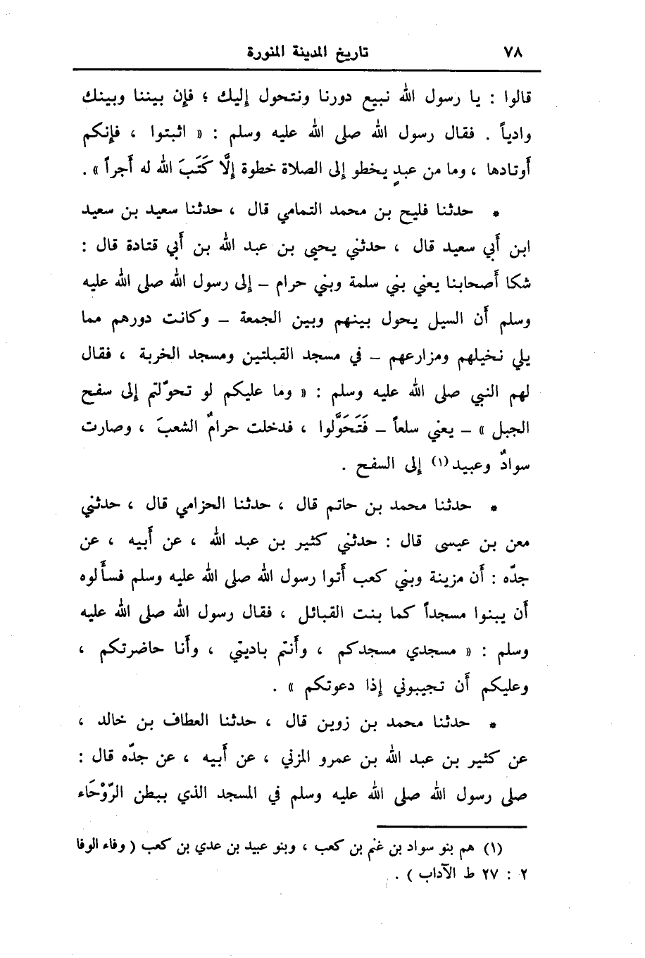 حَدَّثَنَا فُلَيْحُ بْنُ مُحَمَّدٍ التَّمَامِيُّ قَالَ: حَدَّثَنَا سَعِيدُ بْنُ سَعِيدِ بْنِ أَبِي سَعِيدٍ قَالَ: حَدَّثَنِي يَحْيَى بْنُ عَبْدِ اللَّهِ بْنِ أَبِي قَتَادَةَ قَالَ: شَكَا أَصْحَابُنَا يَعْنِي بَنِي سَلَمَةَ وَبَنِي حَرَامٍ، إِلَى رَسُولِ اللَّهِ صَلَّى اللهُ عَلَيْهِ وَسَلَّمَ أَنَّ السَّيْلَ يَحُولُ بَيْنَهُمْ وَبَيْنَ الْجُمُعَةِ - وَكَانَتْ دُورُهُمْ مِمَّا يَلِي نَخِيلَهُمْ وَمَزَارِعَهُمْ - فِي مَسْجِدِ الْقِبْلَتَيْنِ وَمَسْجِدِ الْخَرِبَةِ فَقَالَ لَهُمُ النَّبِيُّ صَلَّى اللهُ عَلَيْهِ وَسَلَّمَ: «§وَمَا عَلَيْكُمْ لَوْ تَحَوَّلْتُمْ إِلَى سَفْحِ الْجَبَلِ» ، يَعْنِي سَلْعًا، فَتَحَوَّلُوا، فَدَخَلَتْ حَرَامٌ الشِّعْبَ، وَصَارَتْ سَوَادٌ وَعَبِيدٌ إِلَى السَّفْحِ "