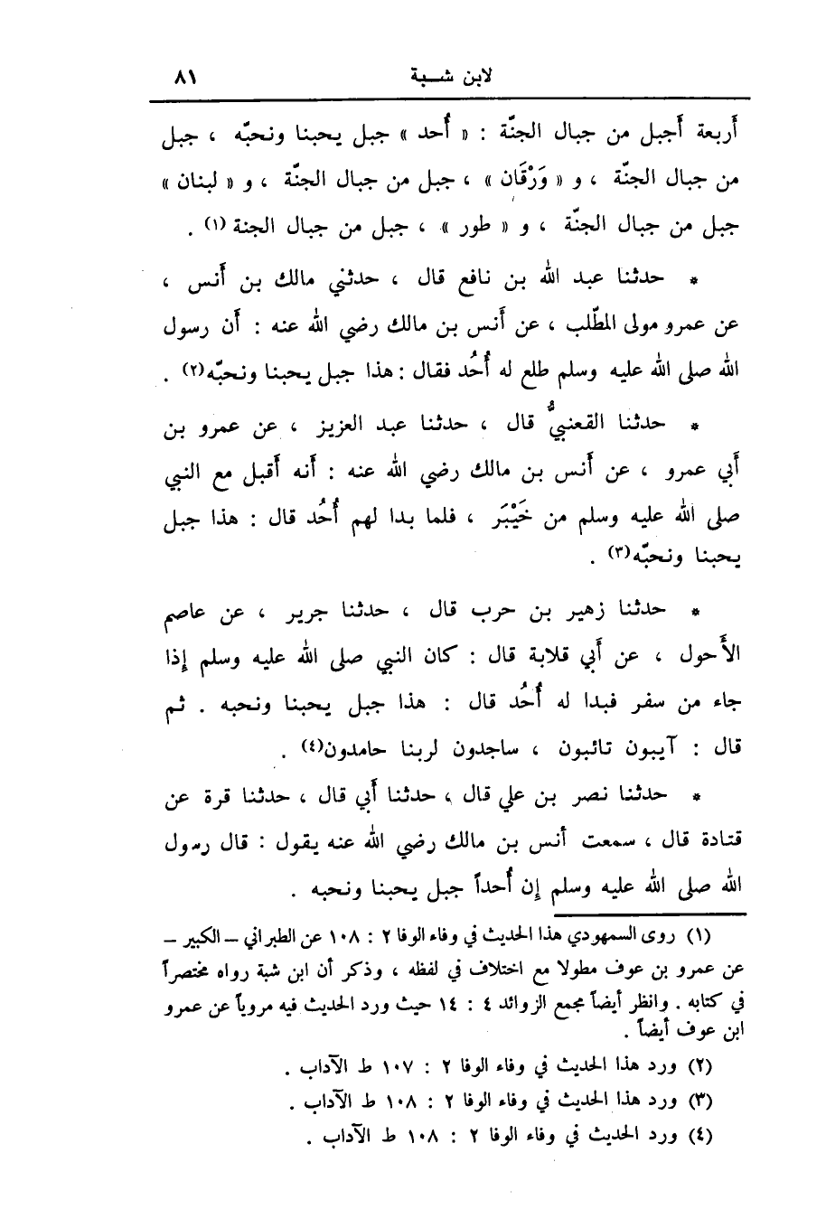 حَدَّثَنَا عَبْدُ اللَّهِ بْنُ نَافِعٍ قَالَ: حَدَّثَنِي مَالِكُ بْنُ أَنَسٍ، عَنْ عَمْرٍو مَوْلَى الْمُطَّلِبِ، عَنْ أَنَسِ بْنِ مَالِكٍ رَضِيَ اللَّهُ عَنْهُ، أَنَّ رَسُولَ اللَّهِ صَلَّى اللهُ عَلَيْهِ وَسَلَّمَ طَلَعَ لَهُ أُحُدٌ فَقَالَ: «§هَذَا جَبَلٌ يُحِبُّنَا وَنُحِبُّهُ»