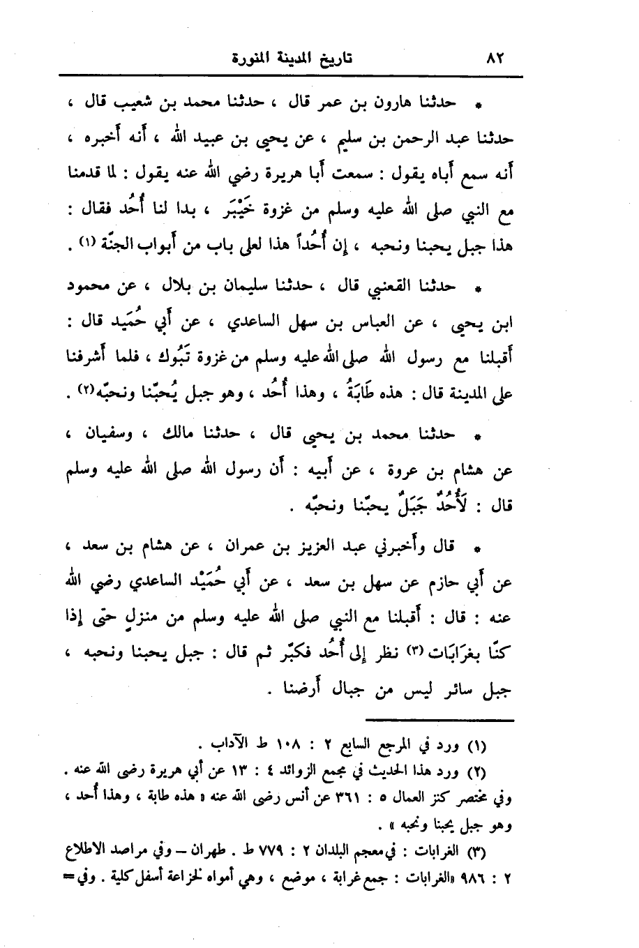 حَدَّثَنَا مُحَمَّدُ بْنُ يَحْيَى قَالَ: حَدَّثَنَا مَالِكٌ، وَسُفْيَانُ، عَنْ هِشَامِ بْنِ عُرْوَةَ، عَنْ أَبِيهِ، أَنَّ رَسُولَ اللَّهِ صَلَّى اللهُ عَلَيْهِ وَسَلَّمَ قَالَ: «§لَأُحُدُ جَبَلٌ يُحِبُّنَا وَنُحِبُّهُ»