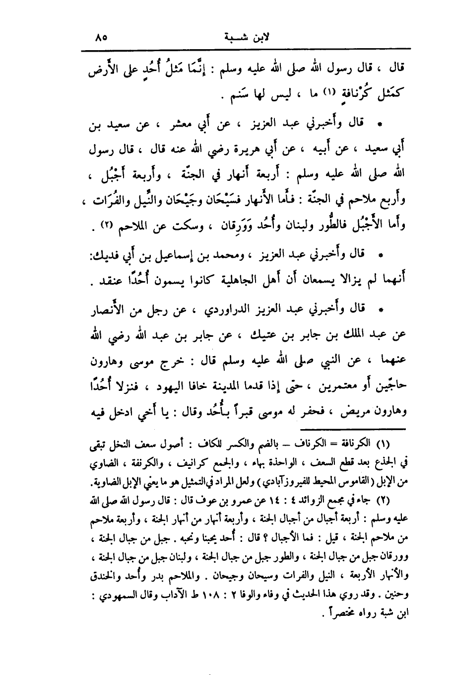 قَالَ: وَأَخْبَرَنِي عَبْدُ الْعَزِيزِ، عَنْ أَبِي مَعْشَرٍ، عَنْ سَعِيدٍ بْنِ أَبِي سَعِيدٍ، عَنْ أَبِيهِ، عَنْ أَبِي هُرَيْرَةَ رَضِيَ اللَّهُ عَنْهُ قَالَ: قَالَ رَسُولُ اللَّهِ صَلَّى اللهُ عَلَيْهِ وَسَلَّمَ: " §أَرْبَعَةُ أَنْهَارٍ فِي الْجَنَّةِ، وَأَرْبَعَةُ أَجْبُلٍ، وَأَرْبَعُ مَلَاحِمَ فِي الْجَنَّةِ: فَأَمَّا الْأَنْهَارُ فَسَيْحَانُ وَجَيْحَانُ وَالنِّيلُ وَالْفُرَاتُ، وَأَمَّا الْأَجْبُلُ فَالطُّورُ وَلُبْنَانُ وَأُحُدٌ وَوَرِقَانُ «، وَسَكَتَ عَنِ الْمَلَاحِمِ» قَالَ: وَأَخْبَرَنِي عَبْدُ الْعَزِيزِ، وَمُحَمَّدُ بْنُ إِسْمَاعِيلَ بْنِ أَبِي فُدَيْكٍ، أَنَّهُمَا لَمْ يَزَالَا يَسْمَعَانِ أَنَّ أَهْلَ الْجَاهِلِيَّةِ كَانُوا يُسَمُّونَ أُحُدًا عَنْقَدَ