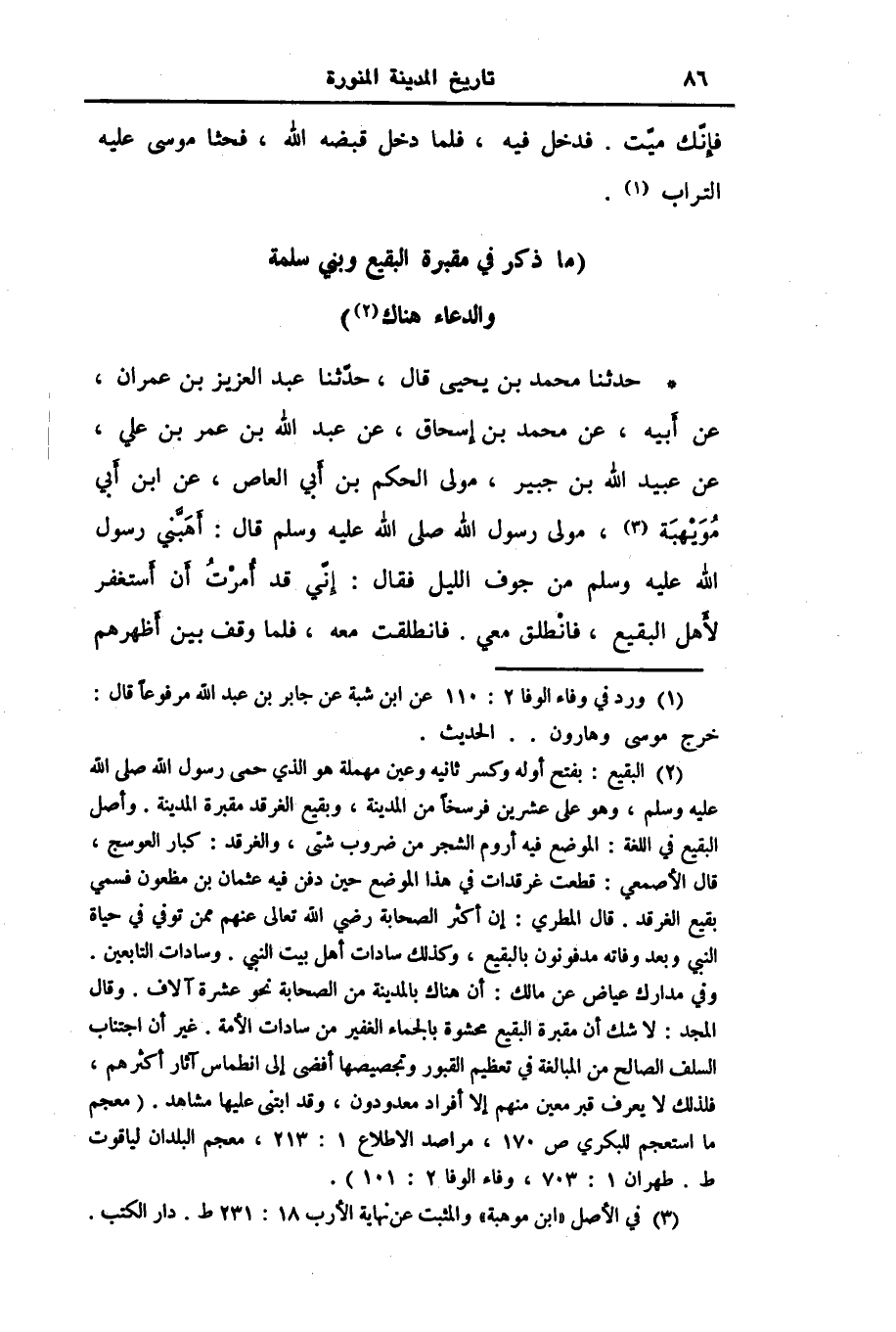 حَدَّثَنَا مُحَمَّدُ بْنُ يَحْيَى قَالَ: حَدَّثَنَا عَبْدُ الْعَزِيزِ بْنُ عِمْرَانَ، عَنْ أَبِيهِ، عَنْ مُحَمَّدِ بْنِ إِسْحَاقَ، عَنْ عَبْدِ اللَّهِ بْنِ عُمَرَ بْنِ عَلِيٍّ، عَنْ عُبَيْدِ اللَّهِ بْنِ جُبَيْرٍ مَوْلَى الْحَكَمِ بْنِ أَبِي الْعَاصِ، عَنِ ابْنِ أَبِي مُوَيْهِبَةَ، مَوْلَى رَسُولِ اللَّهِ صَلَّى اللهُ عَلَيْهِ وَسَلَّمَ قَالَ: أَهَبَّنِي رَسُولُ اللَّهِ صَلَّى اللهُ عَلَيْهِ وَسَلَّمَ مِنْ جَوْفِ اللَّيْلِ فَقَالَ: «§إِنِّي قَدْ أُمِرْتُ أَنْ أَسْتَغْفِرَ لِأَهْلِ الْبَقِيعِ، فَانْطَلِقْ مَعِي» ، فَانْطَلَقْتُ مَعَهُ، فَلَمَّا وَقَفَ بَيْنَ أَظْهُرِهِمْ -[87]- قَالَ: «السَّلَامُ عَلَيْكُمْ يَا أَهْلَ الْمَقَابِرِ، لِيَهْنِ لَكُمْ مَا أَصْبَحْتُمْ فِيهِ مِمَّا أَصْبَحَ النَّاسُ فِيهِ، أَقْبَلَتِ الْفِتَنُ كَقِطَعِ اللَّيْلِ الْمُظْلِمِ يَتْبَعُ آخِرُهَا أَوَّلَهَا، الْآخِرَةُ شَرٌّ مِنَ الْأُولَى» ، ثُمَّ اسْتَغْفَرَ لَهُمْ طَوِيلًا "