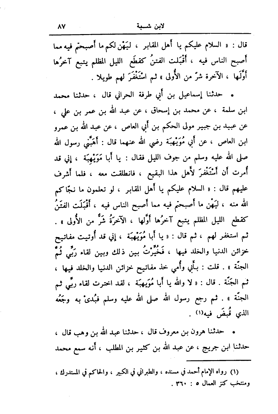 حَدَّثَنَا إِسْمَاعِيلُ بْنُ أَبِي طَرَفَةَ الْحَرَّانِيُّ قَالَ: حَدَّثَنَا مُحَمَّدُ بْنُ سَلَمَةَ، عَنْ مُحَمَّدِ بْنِ إِسْحَاقَ، عَنْ عَبْدِ اللَّهِ بْنِ عُمَرَ بْنِ عَلِيٍّ، عَنْ عُبَيْدِ بْنِ جُبَيْرٍ مَوْلَى الْحَكَمِ بْنِ أَبِي الْعَاصِ، عَنْ عَبْدِ اللَّهِ بْنِ عَمْرِو بْنِ الْعَاصِ، عَنْ أَبِي مُوَيْهِبَةَ رَضِيَ اللَّهُ عَنْهُمَا قَالَ: أَهَبَّنِي رَسُولُ اللَّهِ صَلَّى اللهُ عَلَيْهِ وَسَلَّمَ، مِنْ جَوْفِ اللَّيْلِ فَقَالَ: يَا أَبَا مُوَيْهِبَةَ، إِنِّي قَدْ أُمِرْتُ أَنْ أَسْتَغْفِرَ لِأَهْلِ هَذَا الْبَقِيعِ، فَانْطَلَقْتُ مَعَهُ، فَلَمَّا أَشْرَفَ عَلَيْهِمْ قَالَ: «§السَّلَامُ عَلَيْكُمْ يَا أَهْلَ الْمَقَابِرِ، لَوْ تَعْلَمُونَ مَا نَجَّاكُمُ اللَّهُ مِنْهُ، لِيَهْنِ مَا أَصْبَحْتُمْ فِيهِ مِمَّا أَصْبَحَ النَّاسُ فِيهِ، أَقْبَلَتِ الْفِتَنُ كَقِطَعِ اللَّيْلِ الْمُظْلِمِ يَتْبَعُ آخِرُهَا أَوَّلَهَا، الْآخِرَةُ شَرٌّ مِنَ الْأُولَى» ، ثُمَّ اسْتَغْفَرَ لَهُمْ، ثُمَّ قَالَ: «يَا أَبَا مُوَيْهِبَةَ، إِنِّي قَدْ أُوتِيتُ مَفَاتِيحَ خَزَائِنِ الدُّنْيَا وَالْخُلْدِ فِيهَا، فَخُيِّرْتُ بَيْنَ ذَلِكَ وَبَيْنَ لِقَاءِ رَبِّي ثُمَّ الْجَنَّةِ» ، قُلْتُ: بِأَبِي وَأُمِّي خُذْ مَفَاتِيحَ خَزَائِنِ الدُّنْيَا وَالْخُلْدِ فِيهَا، ثُمَّ الْجَنَّةُ قَالَ: «لَا وَاللَّهِ يَا أَبَا مُوَيْهِبَةَ، لَقَدِ اخْتَرْتُ لِقَاءَ رَبِّي ثُمَّ الْجَنَّةَ» ، ثُمَّ رَجَعَ رَسُولُ اللَّهِ صَلَّى اللهُ عَلَيْهِ وَسَلَّمَ فَبُدِئَ بِهِ وَجَعُهُ الَّذِي قُبِضَ فِيهِ "