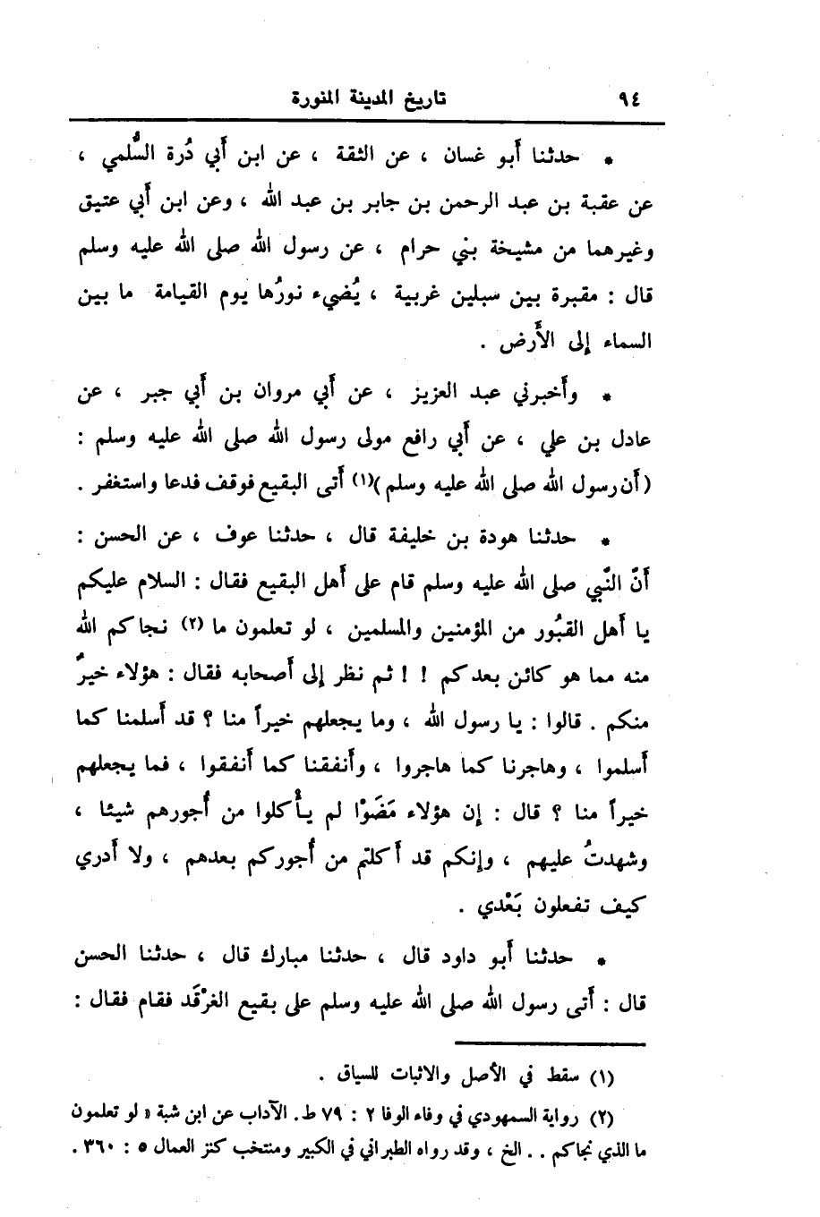 حَدَّثَنَا أَبُو غَسَّانَ، عَنِ الثِّقَةِ، عَنِ ابْنِ أَبِي دُرَّةَ السُّلَمِيِّ، عَنْ عُقْبَةَ بْنِ عَبْدِ الرَّحْمَنِ بْنِ جَابِرِ بْنِ عَبْدِ اللَّهِ، وَعَنِ ابْنِ أَبِي عَتِيقٍ، وَغَيْرِهِمَا، مِنْ مَشْيَخَةِ بَنِي حَرَامٍ، عَنْ رَسُولِ اللَّهِ صَلَّى اللهُ عَلَيْهِ وَسَلَّمَ قَالَ: «§مَقْبَرَةٌ بَيْنَ سَبْلَيْنِ غَرْبِيَّةٌ، يُضِيءُ نُورُهَا يَوْمَ الْقِيَامَةِ مَا بَيْنَ السَّمَاءِ إِلَى الْأَرْضِ»