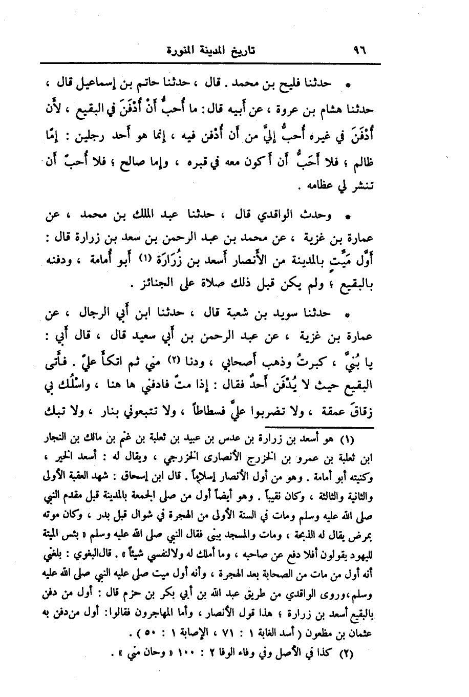 وَحَدَّثَ الْوَاقِدِيُّ قَالَ: حَدَّثَنَا عَبْدُ الْمَلِكِ بْنُ مُحَمَّدٍ، عَنْ عُمَارَةَ بْنِ غَزِيَّةَ، عَنْ مُحَمَّدِ بْنِ عَبْدِ الرَّحْمَنِ بْنِ سَعْدِ بْنِ زُرَارَةَ قَالَ: «§أَوَّلُ مَيِّتٍ بِالْمَدِينَةِ مِنَ الْأَنْصَارِ أَسْعَدُ بْنُ زُرَارَةَ أَبُو أُمَامَةَ، وَدَفَنَهُ بِالْبَقِيعِ، وَلَمْ يَكُنْ قَبْلَ ذَلِكَ صَلَاةٌ عَلَى الْجَنَائِزِ»