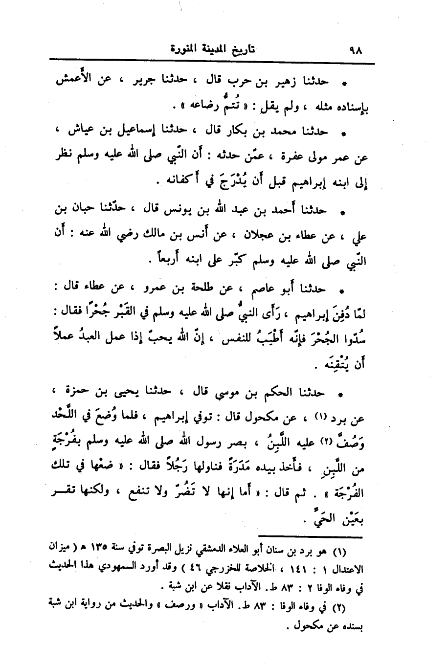 حَدَّثَنَا مُحَمَّدُ بْنُ الْمُنْكَدِرِ قَالَ: حَدَّثَنَا إِسْمَاعِيلُ بْنُ عَيَّاشٍ، عَنْ عُمَرَ، مَوْلَى غُفْرَةَ، عَمَّنْ حَدَّثَهُ، أَنَّ §النَّبِيَّ صَلَّى اللهُ عَلَيْهِ وَسَلَّمَ نَظَرَ إِلَى ابْنِهِ إِبْرَاهِيمَ قَبْلَ أَنْ يُدْرَجَ فِي أَكْفَانِهِ "