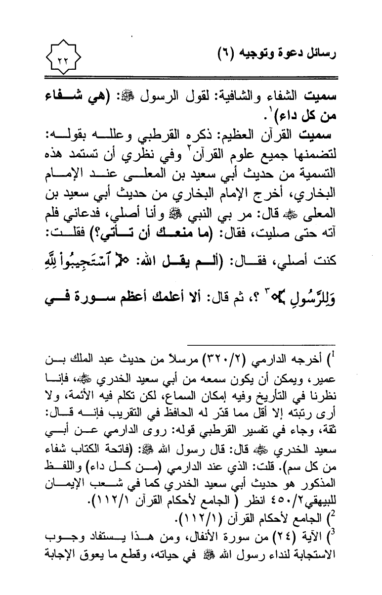 (¬1) أخرجه الدارمي (2/ 320) مرسلاً من حديث عبد الملك بن عمير، ويمكن أن يكون سمعه من أبي سعيد الخدري - رضي الله عنه -، فإنا نظرنا في التأريخ وفيه إمكان السماع، لكن تكلم فيه الأئمة، ولا أرى رتبته إلا أقل مما قدّر له الحافظ في التقريب فإنه قال: ثقة، وجاء في تفسير القرطبي قوله: روى الدارمي عن أبي سعيد الخدري - رضي الله عنه - قال: قال رسول الله - صلى الله عليه وسلم -: (فاتحة الكتاب شفاء من كل سم). قلت: الذي عند الدارمي (من كل داء) واللفظ المذكور هو حديث أبي سعيد الخدري كما في شعب الإيمان للبيهقي 2/ 450 انظر (الجامع لأحكام القرآن 1/ 112).