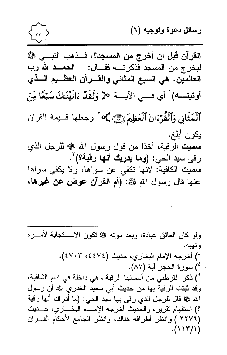 (¬3) ذكر القرطبي من أسمائها الرقية وهي داخلة في اسم الشافية، وقد ثبتت الرقية بها من حديث أبي سعيد الخدري - رضي الله عنه - أن رسول الله - صلى الله عليه وسلم - قال للرجل الذي رقى بها سيد الحي: (ما أدراك أنها رقية؟ ) استفهام تقرير، والحديث أخرجه الإمام البخاري، حديث (2276) وانظر أطرافه هناك، وانظر الجامع لأحكام القرآن (1/ 113).