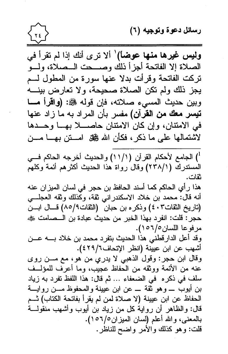 وقال ابن حجر: وقول الذهبي لا يدري من هو، مع من روى عنه من الأئمة ووثقه من الحفاظ عجيب، وما أعرف للمؤلف سلف في ذكره في الضعفاء ... ثم قال: هذا اللفظ تفرد به زياد بن أيوب -وهو ثقة- عن ابن عيينة والمحفوظ من رواية الحفاظ عن ابن عيينة (لا صلاة لمن لم يقرأ بفاتحة الكتاب) ثم قال: والظاهر أن رواية كل من زياد بن أيوب وأشهب منقولة بالمعنى، والله أعلم (لسان الميزان 5/ 156).