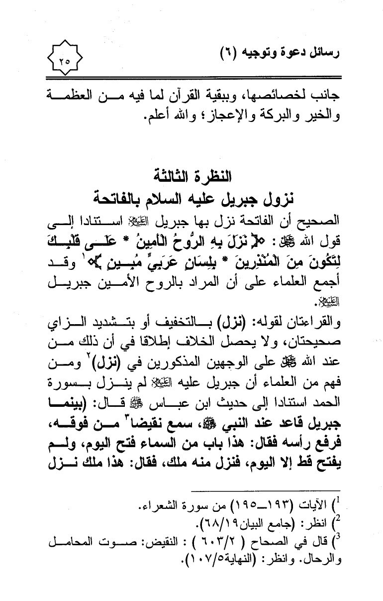 والقراءتان لقوله: (نزل) بالتخفيف أو بتشديد الزاي صحيحتان، ولا يحصل الخلاف إطلاقا في أن ذلك من عند الله - عز وجل - على الوجهين المذكورين في (نزل) (¬2)، ومن فهم من العلماء أن جبريل عليه - عليه السلام - لم ينزل بسورة الحمد استنادا إلى حديث ابن عباس - صلى الله عليه وسلم - قال: (بينما جبريل قاعد عند النبي - صلى الله عليه وسلم -، سمع نقيضا (¬3)، من فوقه، فرفع رأسه فقال: هذا باب من السماء فتح اليوم، ولم يفتح قط إلا اليوم، فنزل منه ملك، فقال: هذا ملك نزل