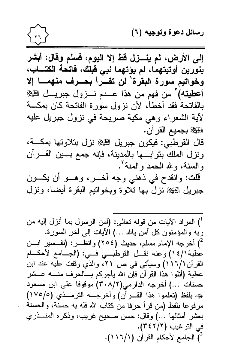 (¬2) أخرجه الإمام مسلم، حديث (254) وانظر: (تفسير ابن عطية 1/ 14) وعنه نقل القرطبي في: (الجامع لأحكام القرآن 1/ 116) وسيأتي في ص 21، والذي وقفت عليه عند ابن عطية (اتلوا هذا القرآن فإن الله يأجركم بالحرف منه عشر حسنات ... ) أخرجه الدارمي (2/ 308) موقوفا على ابن مسعود - رضي الله عنه - بلفظ (تعلموا هذا القرآن) وأخرجه الترمذي (5/ 175) مرفوعا بلفظ (من قرأ حرفا من كتاب الله فله به حسنة، والحسنة بعشر أمثالها ... ) وقال: حسن صحيح غريب، وذكره المنذري في الترغيب (2/ 342).