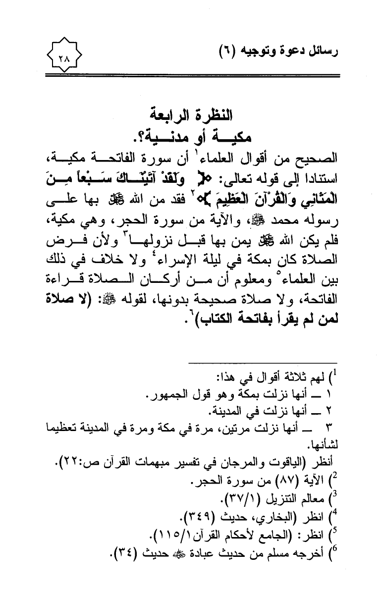 الصحيح من أقوال العلماء (¬1)، أن سورة الفاتحة مكية، استنادا إلى قوله تعالى: {وَلَقَدْ آتَيْنَاكَ سَبْعًا مِنَ الْمَثَانِي وَالْقُرْآنَ الْعَظِيمَ} (¬2)، فقد من الله - عز وجل - بها على رسوله محمد - صلى الله عليه وسلم -، والآية من سورة الحجر، وهي مكية، فلم يكن الله - عز وجل - يمن بها قبل نزولها (¬3) ولأن فرض الصلاة كان بمكة في ليلة الإسراء (¬4)، ولا خلاف في ذلك بين العلماء (¬5)، ومعلوم أن من أركان الصلاة قراءة الفاتحة، ولا صلاة صحيحة بدونها، لقوله - صلى الله عليه وسلم -: (لا صلاة لمن لم يقرأ بفاتحة الكتاب) (¬6).