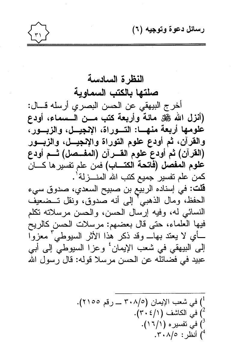 أخرج البيهقي عن الحسن البصري أرسله قال: "أنزل الله - عز وجل - مائة وأربعة كتب من السماء، أودع علومها أربعة منها: التوراة، الإنجيل، والزبور، والقرآن، ثم أودع علوم التوراة والإنجيل، والزبور (القرآن) ثم أودع علوم القرآن (المفصل) ثم أودع علوم المفصل (فاتحة الكتاب فمن علم تفسيرها كان كمن علم تفسير جميع كتب الله المنزلة" (¬1).