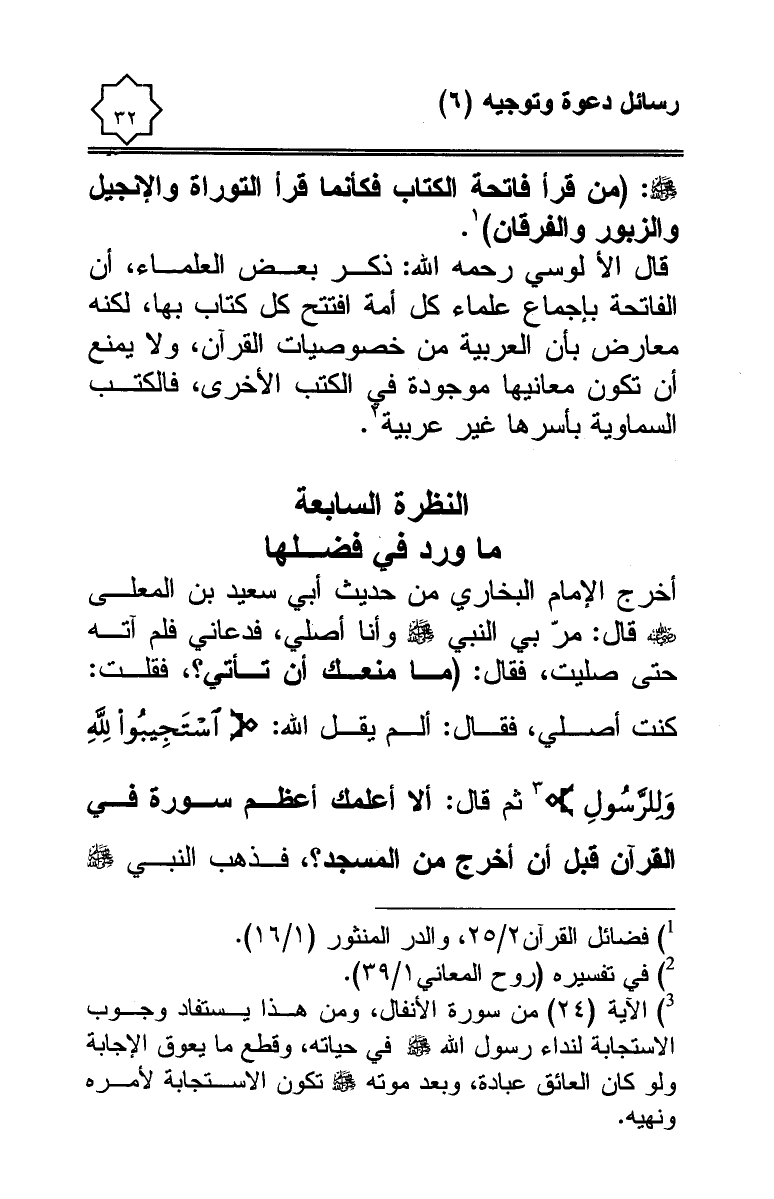 أخرج الإمام البخاري من حديث أبي سعيد بن المعلى - رضي الله عنه - قال: مرّ بي النبي - صلى الله عليه وسلم - وأنا أصلي، فدعاني فلم آته حتى صليت، فقال: (ما منعك أن تأتي؟ ، فقلت: كنت أصلي، فقال: ألم يقل الله: {يَاأَيُّهَا الَّذِينَ آمَنُوا اسْتَجِيبُوا لِلَّهِ وَلِلرَّسُولِ إِذَا دَعَاكُمْ لِمَا يُحْيِيكُمْ} (¬3)، ثم قال: ألا أعلمك أعظم سورة في القرآن قبل أن أخرج من المسجد؟ ، فذهب النبي - صلى الله عليه وسلم -