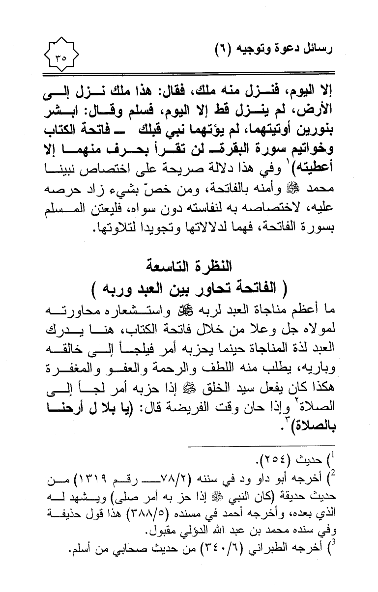 إلا اليوم، فنزل منه ملك، فقال: هذا ملك نزل إلى الأرض، لم ينزل قط إلا اليوم، فسلم وقال: ابشر بنورين أوتيتهما، لم يؤتهما نبي قبلك ــــ فاتحة الكتاب وخواتيم سورة البقرة ـــ لن تقرأ بحرف منهما إلا أعطيته" (¬1)، وفي هذا دلالة صريحة على اختصاص نبينا محمد - صلى الله عليه وسلم - وأمته بالفاتحة، ومن خصّ بشيء زاد حرصه عليه، لاختصاصه به لنفاسته دون سواه، فليعتن المسلم بسورة الفاتحة، فهما لدلالاتها وتجويدا لتلاوتها.