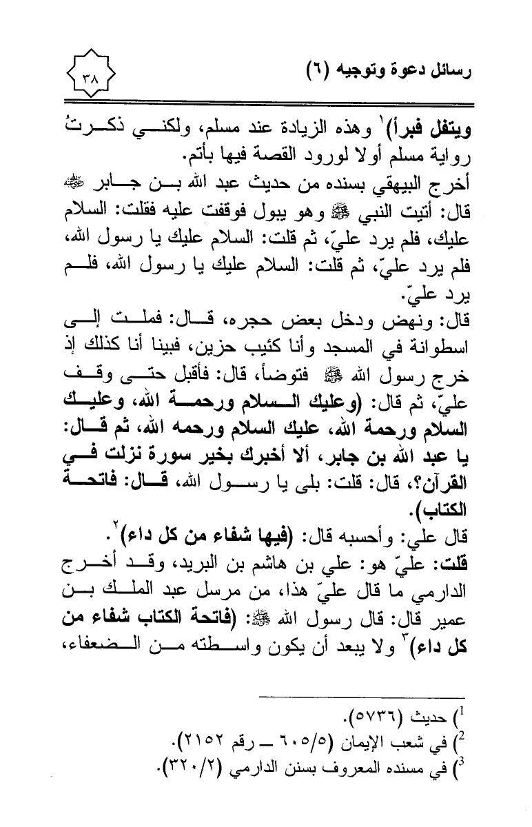 قال: ونهض ودخل بعض حجره، قال: فملت إلى اسطوانة في المسجد وأنا كئيب حزين، فبينا أنا كذلك إذ خرج رسول الله - صلى الله عليه وسلم - فتوضأ، قال: فأقبل حتى وقف عليّ، ثم قال: (وعليك السلام ورحمة الله، وعليك السلام ورحمة الله، عليك السلام ورحمه الله، ثم قال: يا عبد الله بن جابر، ألا أخبرك بخير سورة نزلت في القرآن؟ ، قال: قلت: بلى يا رسول الله، قال: فاتحة الكتاب).