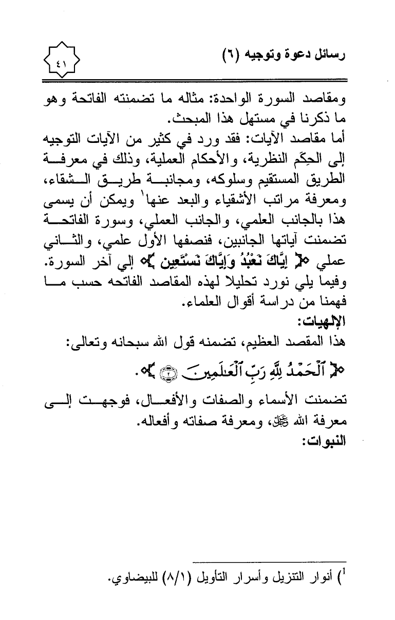 أما مقاصد الآيات: فقد ورد في كثير من الآيات التوجيه إلى الحِكَم النظرية، والأحكام العملية، وذلك في معرفة الطريق المستقيم وسلوكه، ومجانبة طريق الشقاء، ومعرفة مراتب الأشقياء والبعد عنها (¬1)، ويمكن أن يسمى هذا بالجانب العلمي، والجانب العملي، وسورة الفاتحة تضمنت آياتها الجانبين، فنصفها الأول علمي، والثاني عملي {إِيَّاكَ نَعْبُدُ وَإِيَّاكَ نَسْتَعِينُ (5)} إلي آخر السورة. وفيما يلي نورد تحليلا لهذه المقاصد في الفاتحه حسب ما فهمنا من دراسة أقوال العلماء.
