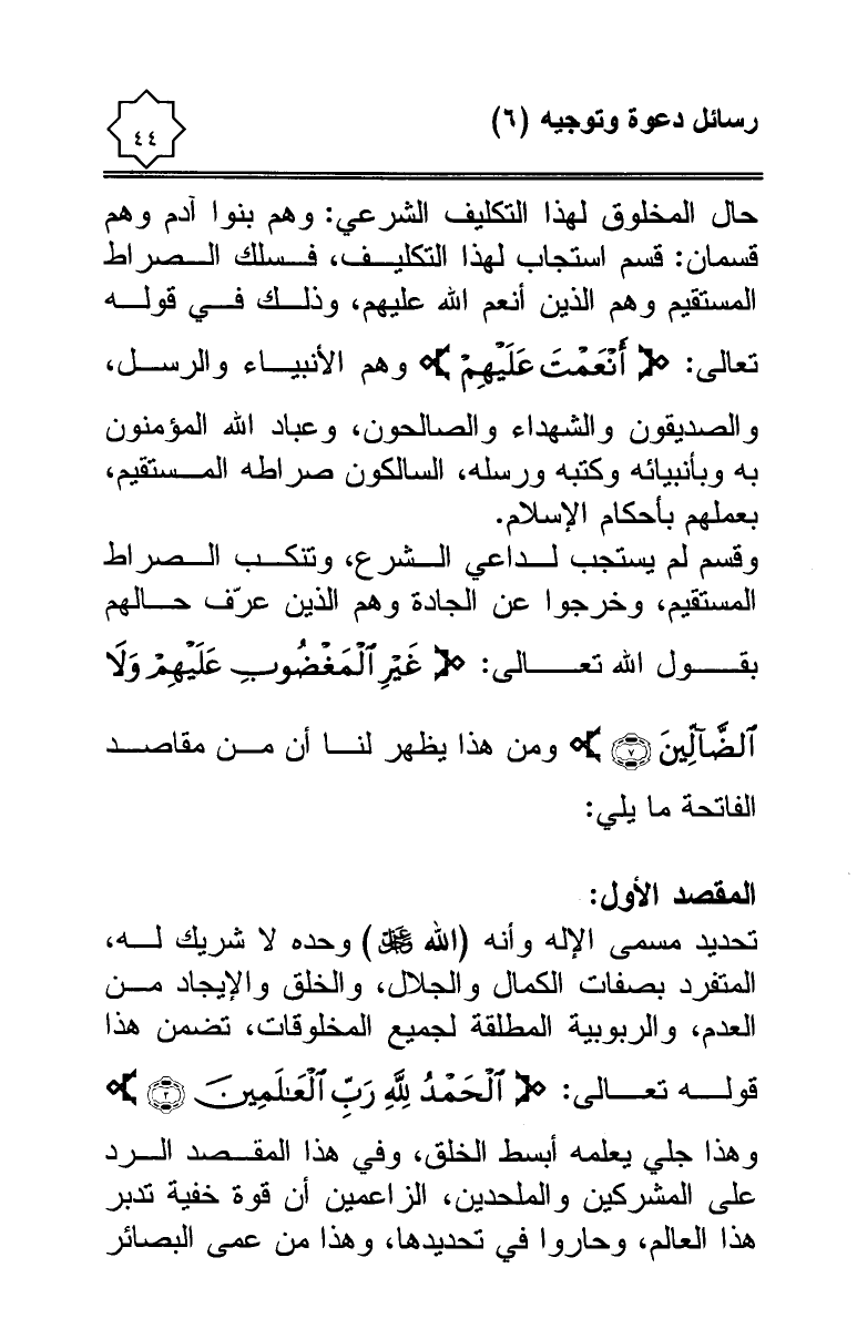 وقسم لم يستجب لداعي الشرع، وتنكب الصراط المستقيم، وخرجوا عن الجادة وهم الذين عرّف حالهم بقول الله تعالى: {غَيْرِ الْمَغْضُوبِ عَلَيْهِمْ وَلَا الضَّالِّينَ (7)} ومن هذا يظهر لنا أن من مقاصد الفاتحة ما يلي: