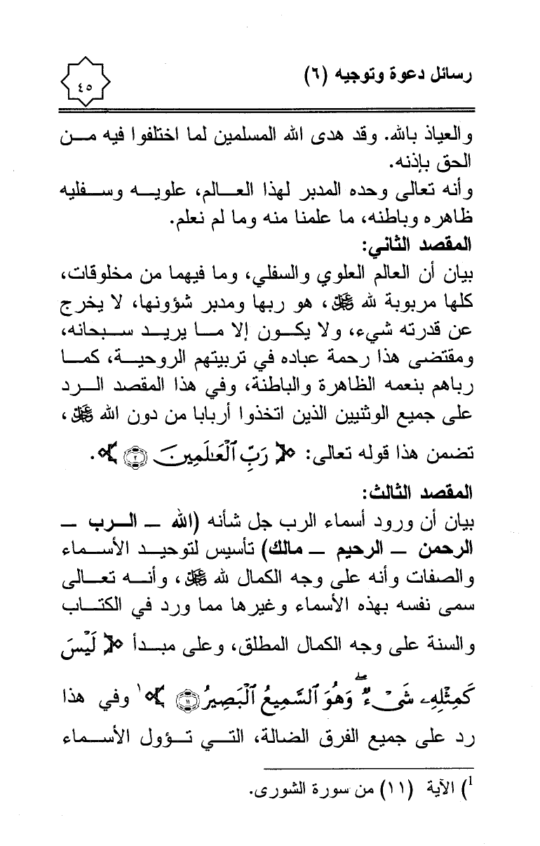 بيان أن ورود أسماء الرب جل شأنه (الله ـــــــــ الرب ـــــــــ الرحمن ــــ الرحيم ــــ مالك) تأسيس لتوحيد الأسماء والصفات وأنه على وجه الكمال لله - عز وجل -، وأنه تعالى سمى نفسه بهذه الأسماء وغيرها مما ورد في الكتاب والسنة على وجه الكمال المطلق، وعلى مبدأ {لَيْسَ كَمِثْلِهِ شَيْءٌ وَهُوَ السَّمِيعُ الْبَصِيرُ} (¬1)، وفي هذا رد على جميع الفرق الضالة، التي تؤول الأسماء