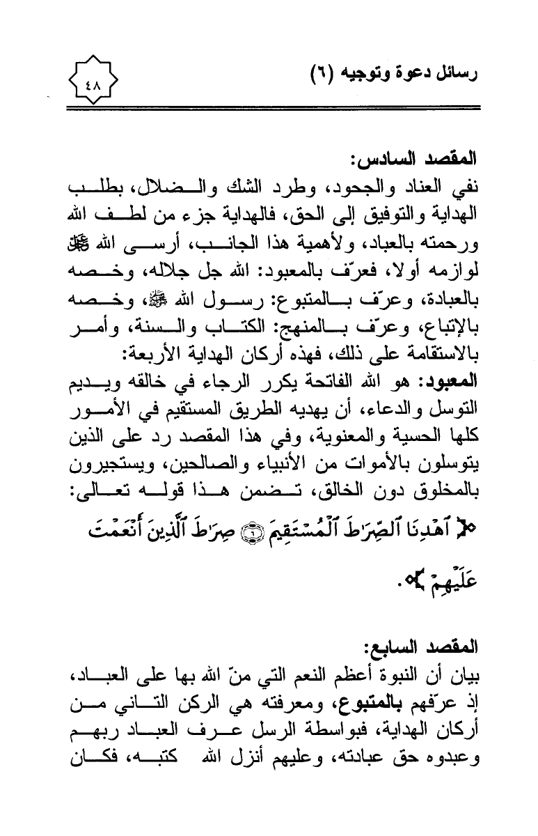 نفي العناد والجحود، وطرد الشك والضلال، بطلب الهداية والتوفيق إلى الحق، فالهداية جزء من لطف الله ورحمته بالعباد، ولأهمية هذا الجانب، أرسى الله - عز وجل - لوازمه أولا، فعرّف بالمعبود: الله جل جلاله، وخصه بالعبادة، وعرّف بالمتبوع: رسول الله - صلى الله عليه وسلم -، وخصه بالإتباع، وعرّف بالمنهج: الكتاب والسنة، وأمر بالاستقامة على ذلك، فهذه أركان الهداية الأربعة: