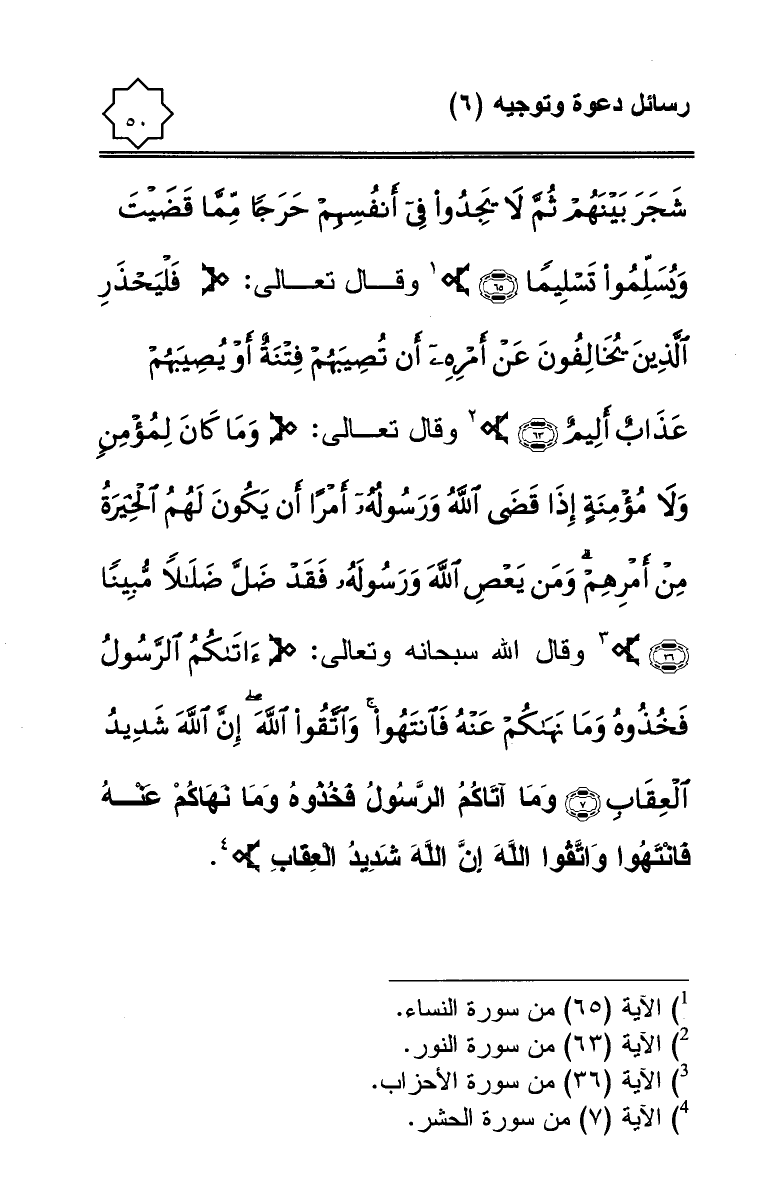 شَجَرَ بَيْنَهُمْ ثُمَّ لَا يَجِدُوا فِي أَنْفُسِهِمْ حَرَجًا مِمَّا قَضَيْتَ وَيُسَلِّمُوا تَسْلِيمًا (65)} (¬1) وقال تعالى: {فَلْيَحْذَرِ الَّذِينَ يُخَالِفُونَ عَنْ أَمْرِهِ أَنْ تُصِيبَهُمْ فِتْنَةٌ أَوْ يُصِيبَهُمْ عَذَابٌ أَلِيمٌ} (¬2)، وقال تعالى: {وَمَا كَانَ لِمُؤْمِنٍ وَلَا مُؤْمِنَةٍ إِذَا قَضَى اللَّهُ وَرَسُولُهُ أَمْرًا أَنْ يَكُونَ لَهُمُ الْخِيَرَةُ مِنْ أَمْرِهِمْ وَمَنْ يَعْصِ اللَّهَ وَرَسُولَهُ فَقَدْ ضَلَّ ضَلَالًا مُبِينًا (36)} (¬3)، وقال الله سبحانه وتعالى: {وَمَا آتَاكُمُ الرَّسُولُ فَخُذُوهُ وَمَا نَهَاكُمْ عَنْهُ فَانْتَهُوا وَاتَّقُوا اللَّهَ إِنَّ اللَّهَ شَدِيدُ الْعِقَابِ} (¬4).