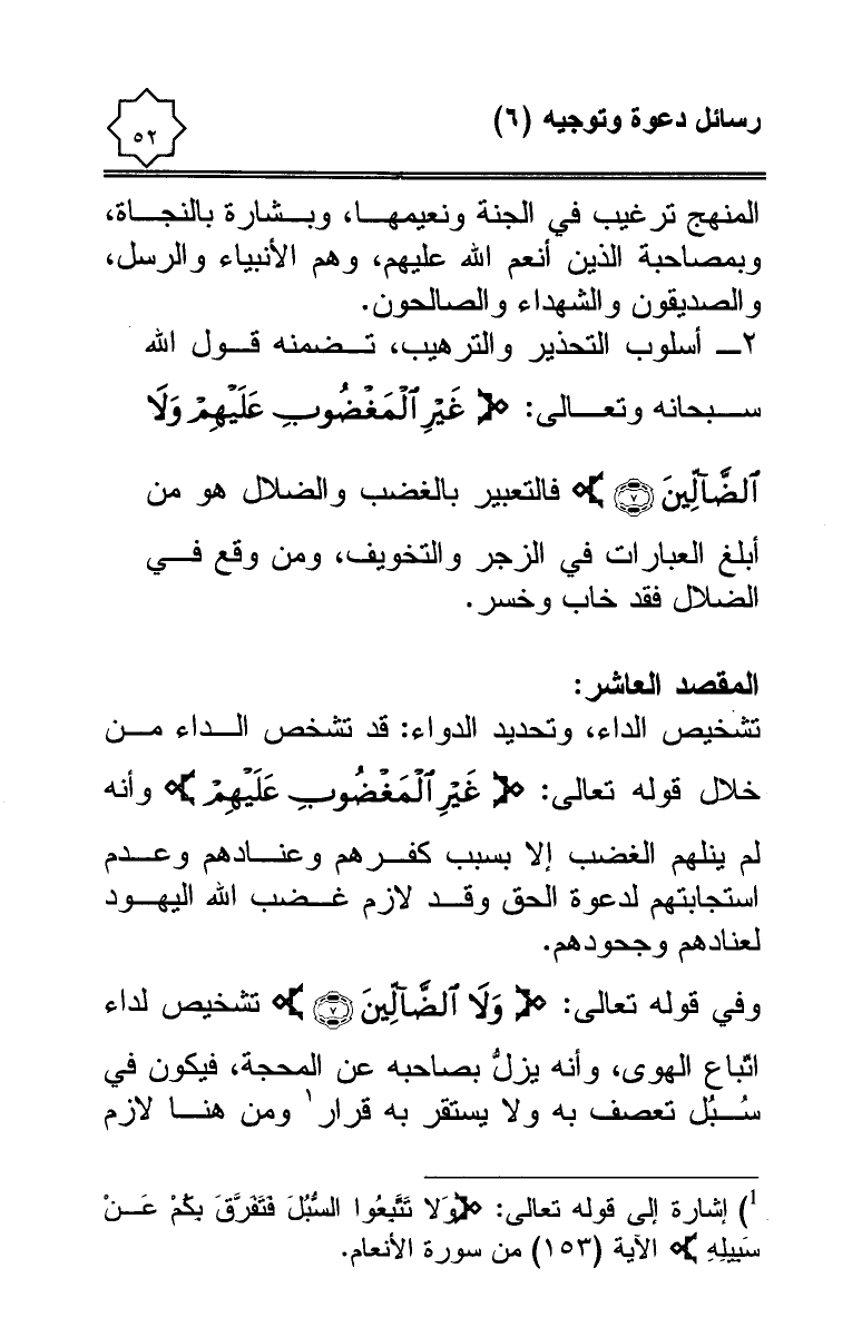 (¬1) إشارة إلى قوله تعالى: {وَلَا تَتَّبِعُوا السُّبُلَ فَتَفَرَّقَ بِكُمْ عَنْ سَبِيلِهِ} الآية (153) من سورة الأنعام.
