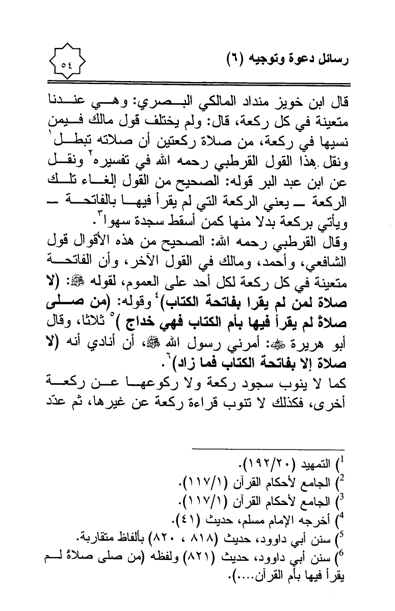 (¬6) سنن أبي داوود، حديث (821) ولفظه (من صلى صلاةً لم يقرأ فيها بأم القرآن ... .).
