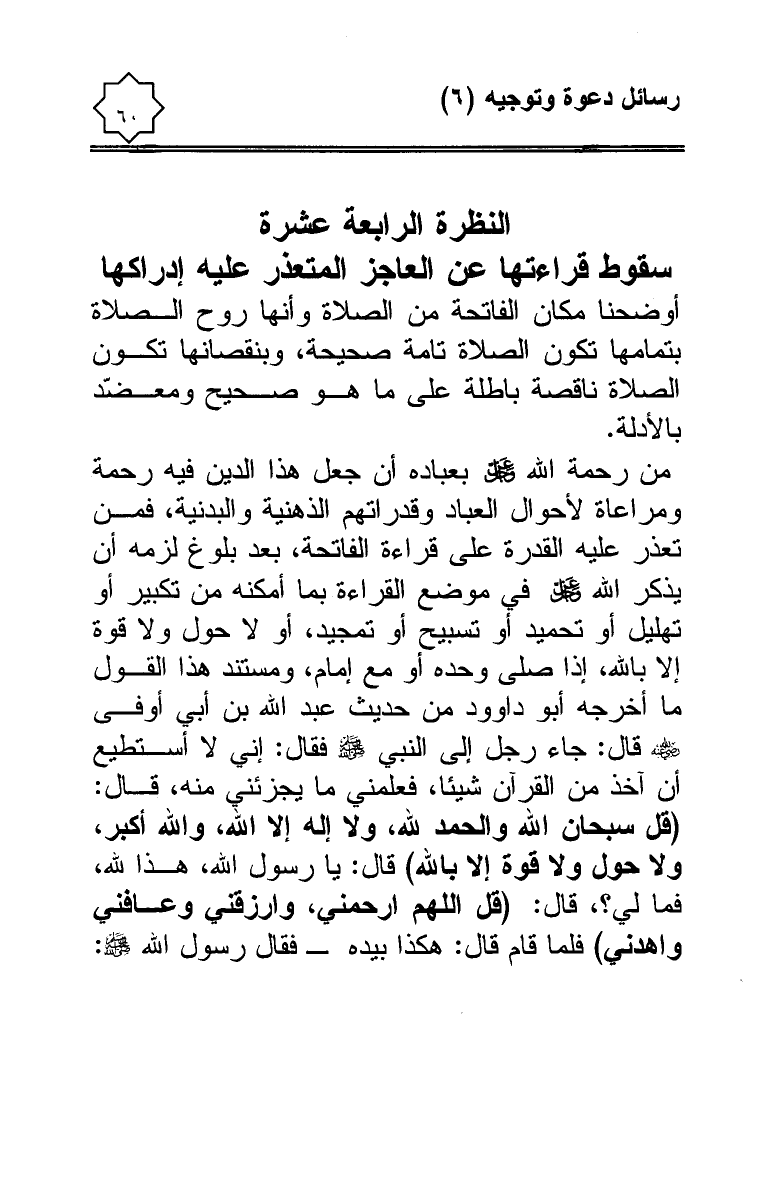 من رحمة الله - عز وجل - بعباده أن جعل هذا الدين فيه رحمة ومراعاة لأحوال العباد وقدراتهم الذهنية والبدنية، فمن تعذر عليه القدرة على قراءة الفاتحة، بعد بلوغ لزمه أن يذكر الله - عز وجل - في موضع القراءة بما أمكنه من تكبير أو تهليل أو تحميد أو تسبيح أو تمجيد، أو لا حول ولا قوة إلا بالله، إذا صلى وحده أو مع إمام، ومستند هذا القول ما أخرجه أبو داوود من حديث عبد الله بن أبي أوفى - رضي الله عنه - قال: جاء رجل إلى النبي - صلى الله عليه وسلم - فقال: إني لا أستطيع أن آخذ من القرآن شيئا، فعلمني ما يجزئني منه، قال: (قل سبحان الله والحمد لله، ولا إله إلا الله، والله أكبر، ولا حول ولا قوة إلا بالله) قال: يا رسول الله، هذا لله، فما لي؟ ، قال: (قل اللهم ارحمني، وارزقني وعافني واهدني) فلما قام قال: هكذا بيده ـــ فقال رسول الله - صلى الله عليه وسلم -: