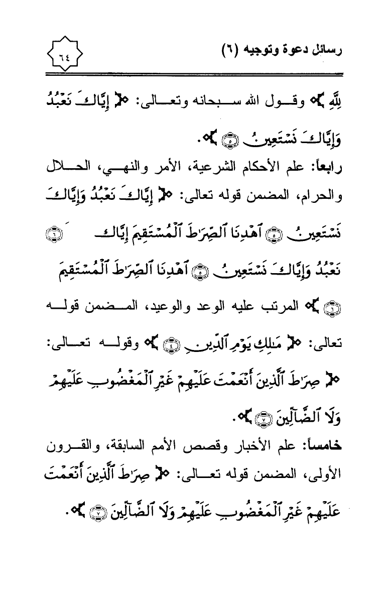 رابعاً: علم الأحكام الشرعية، الأمر والنهي، الحلال والحرام، المضمن قوله تعالى: {إِيَّاكَ نَعْبُدُ وَإِيَّاكَ نَسْتَعِينُ (5) اهْدِنَا الصِّرَاطَ الْمُسْتَقِيمَ} المرتب عليه الوعد والوعيد، المضمن قوله تعالى: {مَالِكِ يَوْمِ الدِّينِ} وقوله تعالى: {صِرَاطَ الَّذِينَ أَنْعَمْتَ عَلَيْهِمْ غَيْرِ الْمَغْضُوبِ عَلَيْهِمْ وَلَا الضَّالِّينَ}.