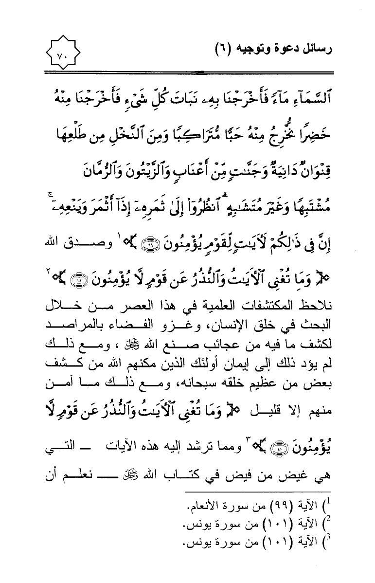 السَّمَاءِ مَاءً فَأَخْرَجْنَا بِهِ نَبَاتَ كُلِّ شَيْءٍ فَأَخْرَجْنَا مِنْهُ خَضِرًا نُخْرِجُ مِنْهُ حَبًّا مُتَرَاكِبًا وَمِنَ النَّخْلِ مِنْ طَلْعِهَا قِنْوَانٌ دَانِيَةٌ وَجَنَّاتٍ مِنْ أَعْنَابٍ وَالزَّيْتُونَ وَالرُّمَّانَ مُشْتَبِهًا وَغَيْرَ مُتَشَابِهٍ انْظُرُوا إِلَى ثَمَرِهِ إِذَا أَثْمَرَ وَيَنْعِهِ إِنَّ فِي ذَلِكُمْ لَآيَاتٍ لِقَوْمٍ يُؤْمِنُونَ} (¬1)، وصدق الله ... {وَمَا تُغْنِي الْآيَاتُ وَالنُّذُرُ عَنْ قَوْمٍ لَا يُؤْمِنُونَ} (¬2)، نلاحظ المكتشفات العلمية في هذا العصر من خلال البحث في خلق الإنسان، وغزو الفضاء بالمراصد لكشف ما فيه من عجائب صنع الله - عز وجل -، ومع ذلك لم يؤد ذلك إلى إيمان أولئك الذين مكنهم الله من كشف بعض من عظيم خلقه سبحانه، ومع ذلك ما آمن منهم إلا قليل، ومما ترشد إليه هذه الآيات ـــــ التي هي غيض من فيض في كتاب الله - عز وجل - ـــــ نعلم أن