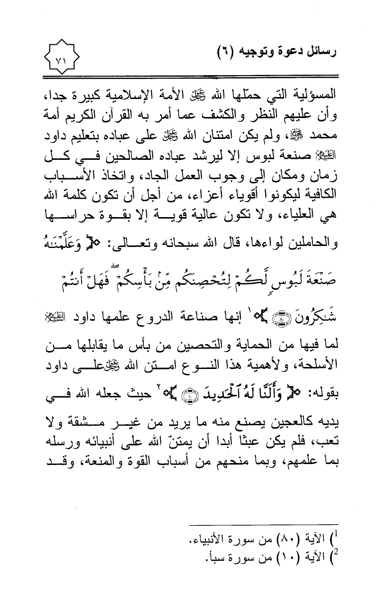 المسؤلية التي حمّلها الله - عز وجل - الأمة الإسلامية كبيرة جدا، وأن عليهم النظر والكشف عما أمر به القرآن الكريم أمة محمد - صلى الله عليه وسلم -، ولم يكن امتنان الله - عز وجل - على عباده بتعليم داود - عليه السلام - صنعة لبوس إلا ليرشد عباده الصالحين في كل زمان ومكان إلى وجوب العمل الجاد، واتخاذ الأسباب الكافية ليكونوا أقوياء أعزاء، من أجل أن تكون كلمة الله هي العليا، ولا تكون عالية قوية إلا بقوة حراسها والحاملين لواءها، قال الله تعالى: {وَعَلَّمْنَاهُ صَنْعَةَ لَبُوسٍ لَكُمْ لِتُحْصِنَكُمْ مِنْ بَأْسِكُمْ فَهَلْ أَنْتُمْ شَاكِرُونَ} (¬1)، إنها صناعة الدروع علمها داود - عليه السلام - لما فيها من الحماية والتحصين من بأس ما يقابلها من الأسلحة، ولأهمية هذا النوع امتن الله - عز وجل - على داود بقوله: {وَأَلَنَّا لَهُ الْحَدِيدَ} (¬2)، حيث جعله الله في يديه كالعجين يصنع منه ما يريد من غير مشقة ولا تعب، فلم يكن عبثا أبدا أن يمتنّ الله على أنبيائه ورسله بما علمهم، وبما منحهم من أسباب القوة والمنعة، وقد
