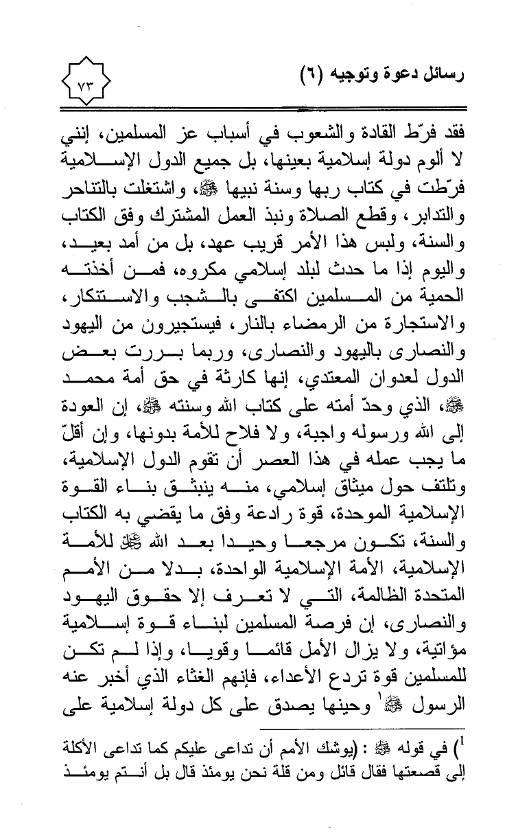 فقد فرّط القادة والشعوب في أسباب عز المسلمين، إنني لا ألوم دولة إسلامية بعينها، بل جميع الدول الإسلامية فرّطت في كتاب ربها وسنة نبيها - صلى الله عليه وسلم -، واشتغلت بالتناحر والتدابر، وقطع الصلاة ونبذ العمل المشترك وفق الكتاب والسنة، وليس هذا الأمر قريب عهد، بل من أمد بعيد، واليوم إذا ما حدث لبلد إسلامي مكروه، فمن أخذته الحمية من المسلمين اكتفى بالشجب والاستنكار، والاستجارة من الرمضاء بالنار، فيستجيرون من اليهود والنصارى باليهود والنصارى، وربما بررت بعض الدول لعدوان المعتدي، إنها كارثة في حق أمة محمد - صلى الله عليه وسلم -، الذي وحدّ أمته على كتاب الله وسنته - صلى الله عليه وسلم -، إن العودة إلى الله ورسوله واجبة، ولا فلاح للأمة بدونها، وإن أقلّ ما يجب عمله في هذا العصر أن تقوم الدول الإسلامية، وتلتف حول ميثاق إسلامي، منه ينبثق بناء القوة الإسلامية الموحدة، قوة رادعة وفق ما يقضي به الكتاب والسنة، تكون مرجعا وحيدا بعد الله - عز وجل - للأمة الإسلامية، الأمة الإسلامية الواحدة، بدلا من الأمم المتحدة الظالمة، التي لا تعرف إلا حقوق اليهود والنصارى، إن فرصة المسلمين لبناء قوة إسلامية مؤاتية، ولا يزال الأمل قائما وقويا، وإذا لم تكن للمسلمين قوة تردع الأعداء، فإنهم الغثاء الذي أخبر عنه الرسول - صلى الله عليه وسلم - (¬1)، وحينها يصدق على كل دولة إسلامية على