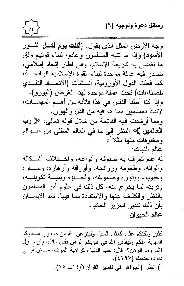 وجه الأرض المثل الذي يقول: "أكلت يوم أكل الثور الأسود" وإذا ما تنبه المسلمون وعادوا لبناء قوتهم وفق ما تقضي به شريعة الإسلام، وفي إطار إتحاد إسلامي، تصدر فيه عملة موحدة لبناء القوة الإسلامية الرادعة، كما فعلت الدول الأوروبية، أنشأت "الاتحاد النقدي للصناعات" تحت عملة موحدة لهذا الغرض (اليورو).