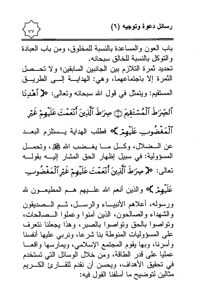 تحديد ثمرة التلازم بين الجانبين السابقين؛ ولا تحصل الثمرة إلا باجتماعهما، وهي: الهداية إلى الطريق المستقيم: ويتمثل في قول الله سبحانه وتعالى: {اهْدِنَا الصِّرَاطَ الْمُسْتَقِيمَ * صِرَاطَ الَّذِينَ أَنْعَمْتَ عَلَيْهِمْ غَيْرِ الْمَغْضُوبِ عَلَيْهِمْ وَلَا الضَّالِّينَ} فطلب الهداية يستلزم البعد عن الضلال، وكل ما يغضب الله - عز وجل -، وتحمل المسؤولية: في سبيل إظهار الحق المشار إليه بقوله تعالى: {صِرَاطَ الَّذِينَ أَنْعَمْتَ عَلَيْهِمْ غَيْرِ الْمَغْضُوبِ عَلَيْهِمْ وَلَا الضَّالِّينَ} والذين أنعم الله عليهم هم المطيعون لله ورسوله، أعلاهم الأنبياء والرسل، ثم الصديقون والشهداء والصالحون، الذين آمنوا وعملوا الصالحات، وتواصوا بالحق وتواصوا بالصبر، وهذا يجعلنا نتعرف على المسؤوليات المنوطة بنا شرعا، ونربي عليها أنفسنا وأسرنا، وبها يقوم المجتمع الإسلامي، ويمارسها واقعا عمليا على قدر الطاقة، ومن خلال الوسائل التي تستخدم في تحقيق الأهداف، ويحسن أن نقدم للقارئ الكريم مثالين لتوضيح ما أسلفنا القول فيه: