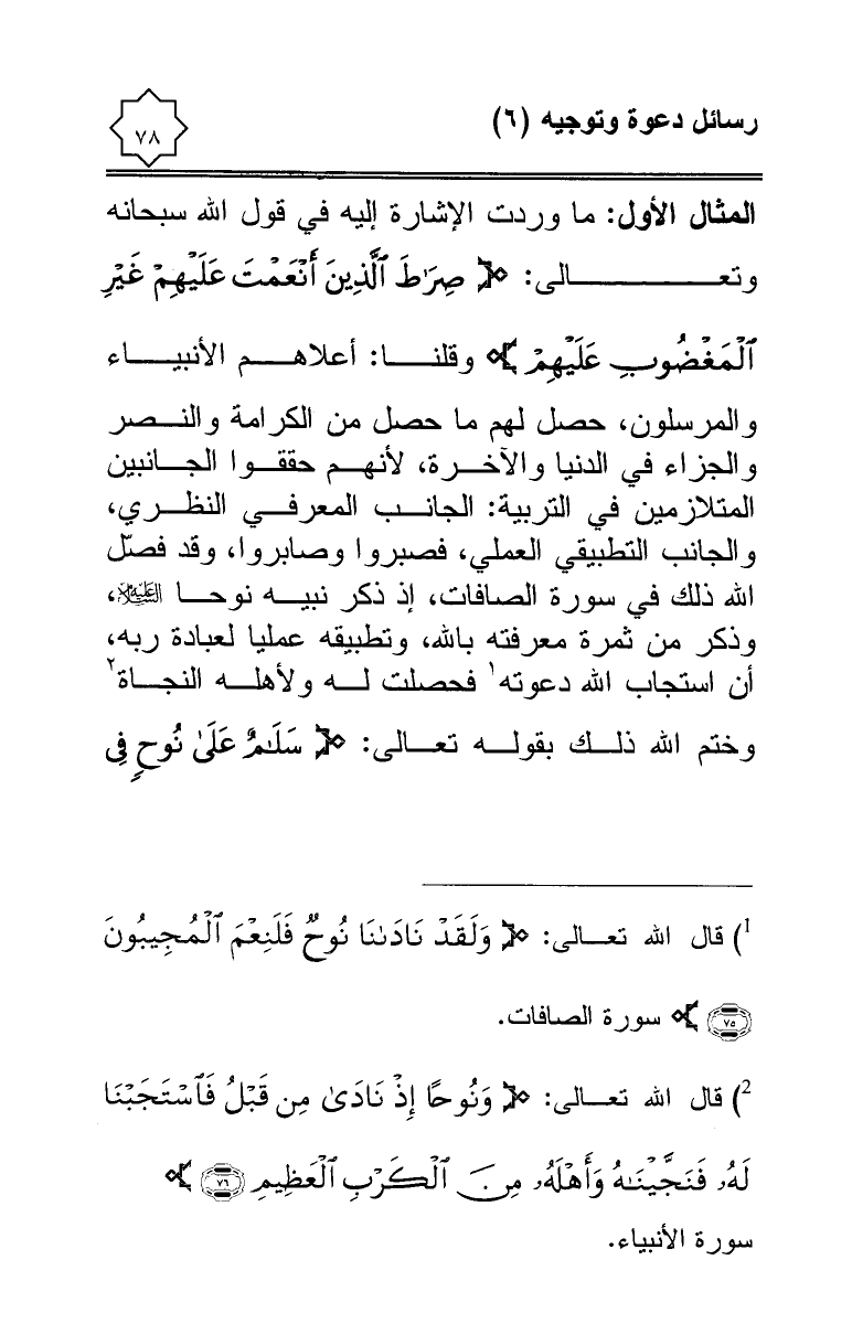 المثال الأول: ما وردت الإشارة إليه في قول الله سبحانه وتعالى: {صِرَاطَ الَّذِينَ أَنْعَمْتَ عَلَيْهِمْ غَيْرِ الْمَغْضُوبِ عَلَيْهِمْ وَلَا الضَّالِّينَ} وقلنا: أعلاهم الأنبياء والمرسلون، حصل لهم ما حصل من الكرامة والنصر والجزاء في الدنيا والآخرة، لأنهم حققوا الجانبين المتلازمين في التربية: الجانب المعرفي النظري، والجانب التطبيقي العملي، فصبروا وصابروا، وقد فصّل الله ذلك في سورة الصافات، إذ ذكر نبيه نوحا - عليه السلام -، وذكر من ثمرة معرفته بالله، وتطبيقه عمليا لعبادة ربه، أن استجاب الله دعوته (¬1)، فحصلت له ولأهله النجاة (¬2)، وختم الله ذلك بقوله تعالى: {سَلَامٌ عَلَى نُوحٍ فِي