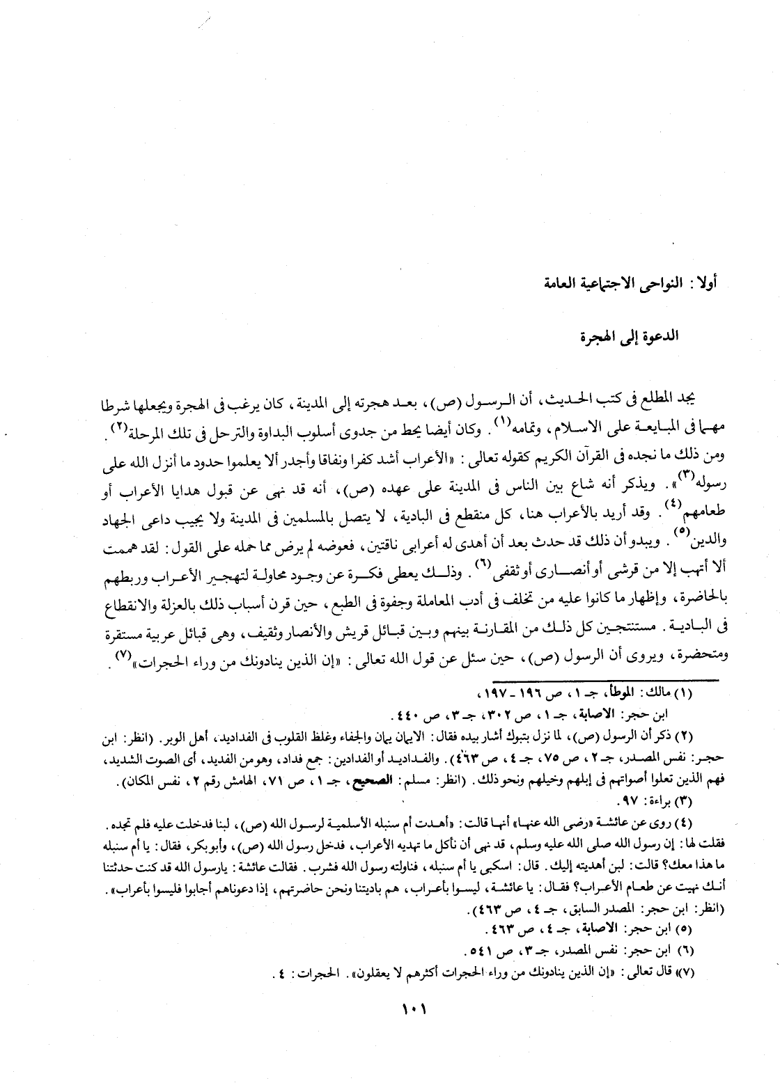 (1) مالك: الموطأ، جـ1، ص196 - 197. ابن حجر: الأصابة، جـ1، ص302، جـ3، ص440. (2) ذكر أن الرسول صلى الله عليه وسلم، لما نزل بتبوك أشار بيده فقال: الإيمان يمان والجفاء وغلظ القلوب في الفداديد، أهل الوبر. (انظر: ابن حجر: نفس المصدر، جـ2، ص75، جـ4، ص463). والفداديد أو الفدادين: جمع فداد، وهو من الفديد، أي الصوت الشديد، فهم الذين تعلوا أصواتهم في إبلهم وخيلهم ونحو ذلك. (انظر: مسلم: الصحيح، جـ1، ص71، الهامش رقم 2، نفس المكان). (3) براءة: 97. (4) روى عن عائشة "رضي الله عنها" أنها قالت: "أهدت أم سنبله الأسلمية لرسول الله صلى الله عليه وسلم، لبناً فدخلت عليه فلم تجده، فقلت لها: إن رسول الله صلى الله عليه وسلم، قد نهى أن نأكل ما تهديه الأعراب، فدخل رسول الله صلى الله عليه وسلم، وأبو بكر، فقال: يا أم أسنبةل ما هذا معك؟ قالت: لبن أهديته إليك. قال: اسكبي يا أم سنبلة، فناولته رسول الله فشرب. فقالت عائشة: يا رسول الله قد كنت حدثتنا أنك نهيت عن طعام الأعراب؟ فقال: يا عائشة، ليسوا بأعراب، هم باديتنا ونحن حاضرتهم، إذا دعوناهم أجابوا فليسوا بأعراب". (انظر: ابن حجر: المصدر السابق، جـ4، ص463). (5) ابن حجر: الإصابة، جـ4، ص463. (6) ابن حجر: نفس المصدر، جـ3، ص541. (7) قال تعالى: "إن الذين ينادونك من وراء الحجرات أكثرهم لا يعقلون". الحجرات: 4.