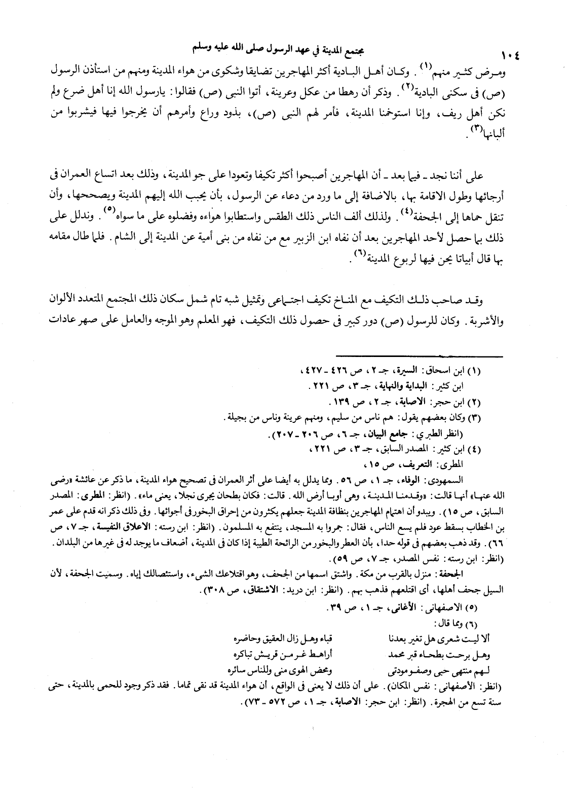 104…ومرض كثير منهم (1). وكان أهل البادية أكثر المهاجرين تضايقاً وشكوى من هواء المدينة ومنهم من استأذن الرسول صلى الله عليه وسلم في سكنى البادية (2). وذكر أن رهطاً من عكل وعرينة، أتوا النبي صلى الله عليه وسلم فقالوا: يا رسول الله إنا أهل ضرع ولم نكن أهل ريف، وإنا استوخنا المدينة، فأمر لهم النبي صلى الله عليه وسلم، بذود وراع وأمرهم أن يخرجوا فيها فيشروبا من ألبانها (3). على أننا نجد - فيما بعد - أن المهاجرين أصبحوا أكثر تكيفاً وتعوداً على جو المدينة، وذلك بعد اتساع العمران في أرجائها وطول الإقامة بها، بالإضافة إلى ما ورد من دعاء عن الرسول، بأن يجبب الله إليهم ويصححها، وأن تنقل حماها إلى الجحفة (4). ولذلك ألف الناس ذلك الطقس واستطابوا هواءه وفضلوه على ما سواه (5). وندلل على ذلك بما حصل لأحد المهاجرين بعدأن نفاه ابن الزبير مع من نفاه من بني امية عن المدينة إلى الشام. فلما طال مقامه بها قال أبياتاً يحن فيها لربوع المدينة (6). وقد صاحب ذلك التكيف مع المناخ تكيف اجتماعي وتمثيل شبه تام شمل سكان ذلك المجتمع المتعدد الألوان والأشربة. وكان للرسول صلى الله عليه وسلم دور كبير في حصول ذلك التكيف، فهو المعلم وهو الموجه والعامل على صهر عادات…